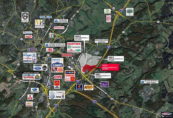 Staunton Crossing Lot 6, 8 acres of prime B-2 divisible land ideal for retail development, is in a great location in rapidly growing Staunton, VA. Up to 50 total acres available. This property is an ideal setting for retail and land investment opportunities and offers excellent transportation characteristics that make it accessible to businesses and customers alike. One of the key transportation features of Staunton Crossing is its almost 1-mile frontage on Interstate 81 at Exit 222 and its location at the intersection of I-81 and I-64. This central location provides easy access to major highways, making it an accessible location for businesses to transport goods and services in the heart of the Shenandoah Valley. Retailers, QSR's, hotels, restaurants, and grocery stores welcome!