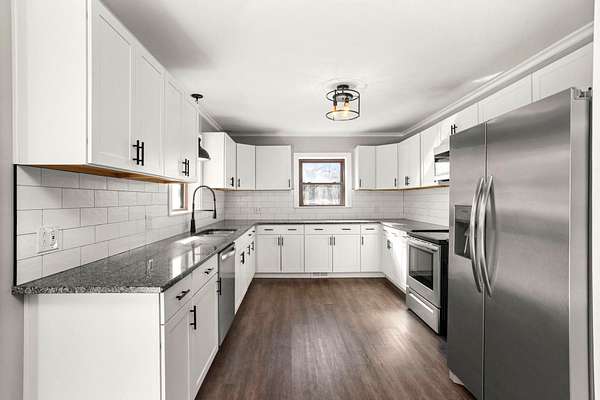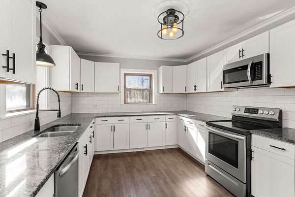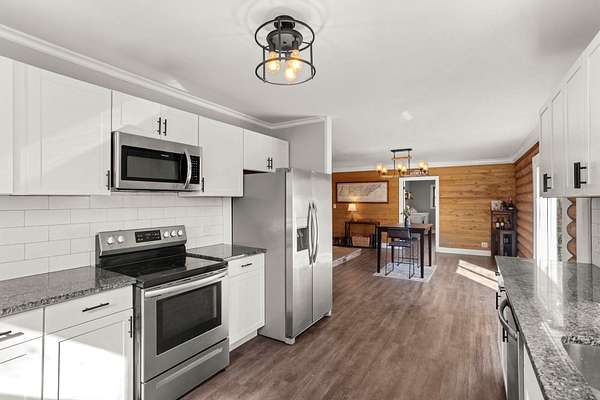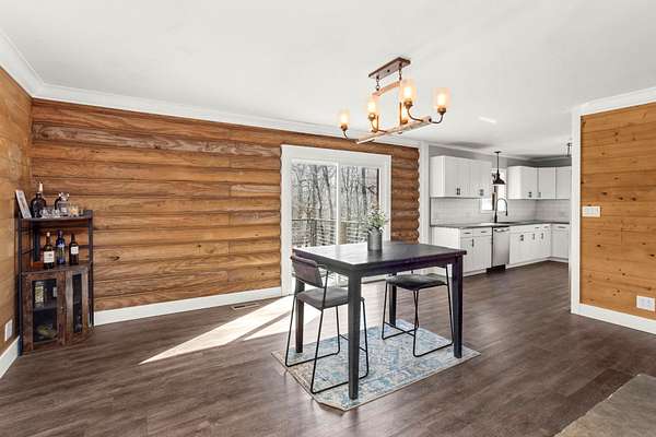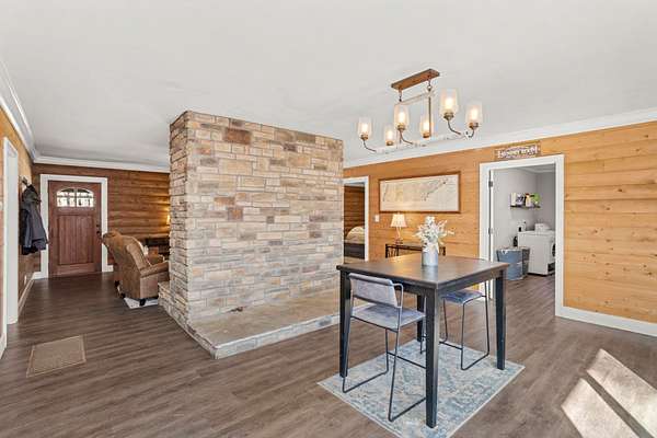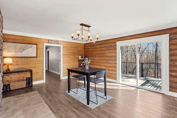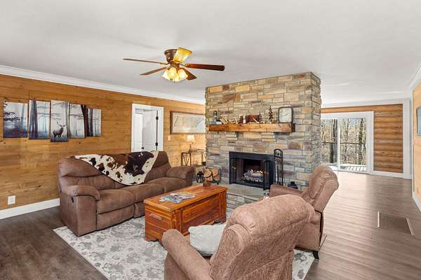 Step inside to a warm and inviting main level where an inviting floor-to-ceiling stone gas fireplace anchors the living space and creates a cozy gathering spot during cooler months. The fireplace subtly divides the living and dining areas, while the bright, remodeled kitchen features white cabinetry, laminate wood flooring, and easy flow for everyday living or entertaining. The dining area opens to a large sliding glass door leading to the back deck overlooking the wooded acreage -- a perfect spot for morning coffee or quiet evenings.
