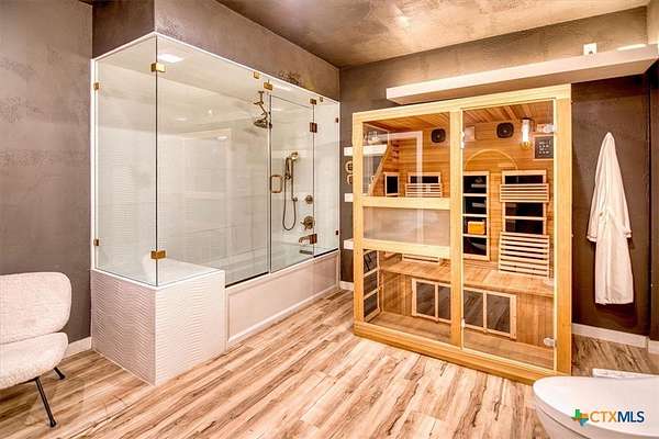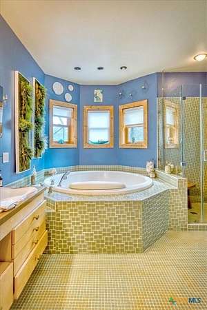 - Breakfast Area, Breakfast Bar, Ceiling Fans, Double Vanity, Eat In Kitchen, High Ceilings, Jetted Tub, Kitchen Dining Combo, Kitchen Island, Main Level Primary, Multiple Living Areas, Pantry, Primary Downstairs, Sauna, Walk In Closets