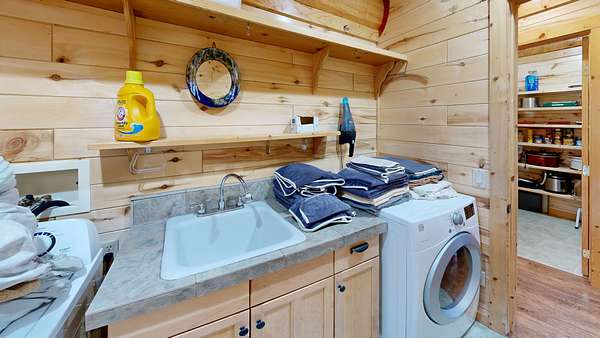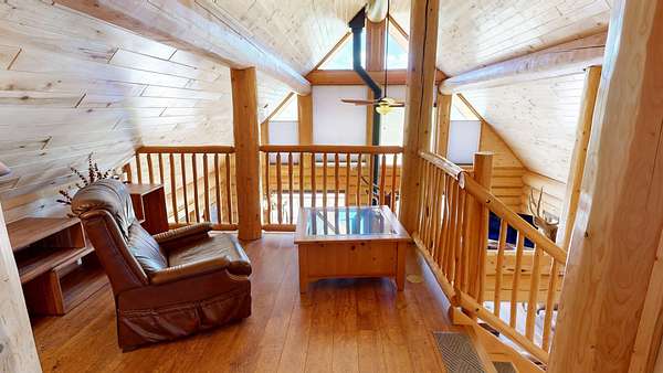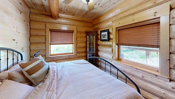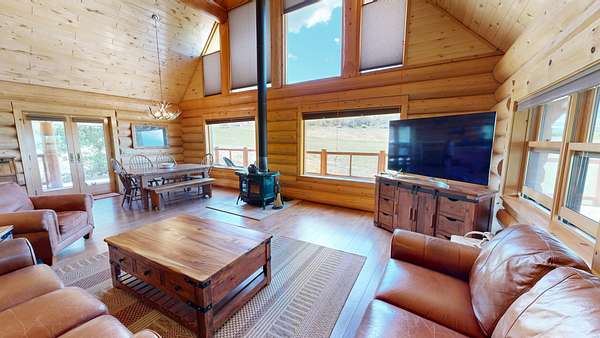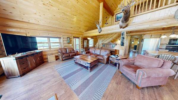 Built with Canadian spruce logs the main home features a cathedral ceiling great room, open kitchen, cozy downstairs bedrooms, and a luxurious upstairs master suite with a five-piece bath and custom tilework. Downstairs includes a storage area, workshop, and mechanical room. The captivating framework of this beautiful log home is the covered deck that wraps around three sides of the home, providing a great place to enjoy the views, sunsets, and wildlife.