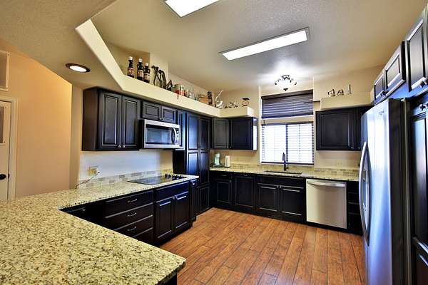 Floor to ceiling windows with a wide ledge sill and views and the ceiling window skylight offer natural lighting to enhance the attractive color scheme. The large living area with the gas fireplace create a welcoming comfy atmosphere. Cook a meal or fix snacks in the adjoining Chef's kitchen with the state of the art stainless steel appliances. Electric cooktop range with overhead range, dishwasher, double door fridge, double ovens, deep double sink with pull down arch faucet are placed for perfect access in efficiency meal prep. Granite counters with tile backsplash and soft close dark wood cabinets add to the beauty. Adjoining breakfast nook and formal dining area offer more room for meals or gatherings. Double swinging doors lead to a large utility room for extra storage and to the laundry/mud room for washer and dryer, cupboards, shelving, 1/2 bath, outside access with pet door. Linen and coat closet in hallway leading to bedrooms.