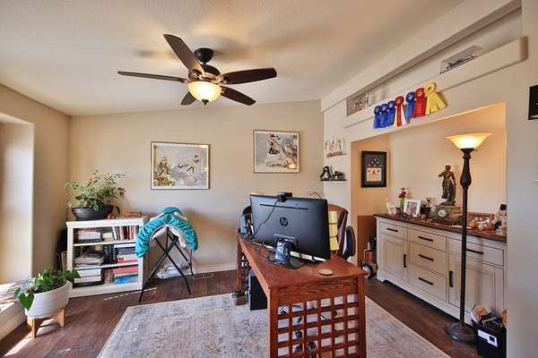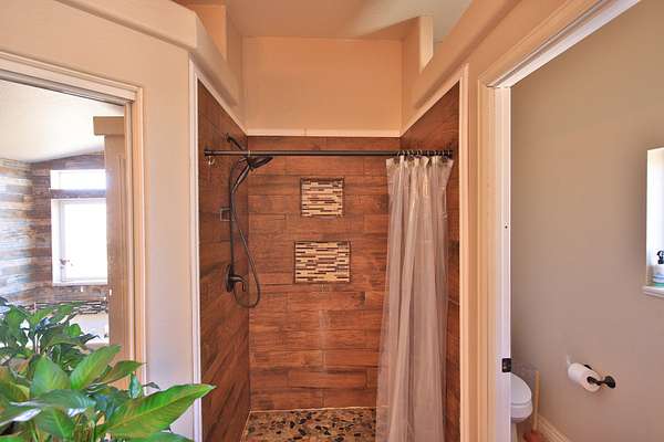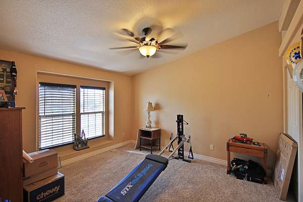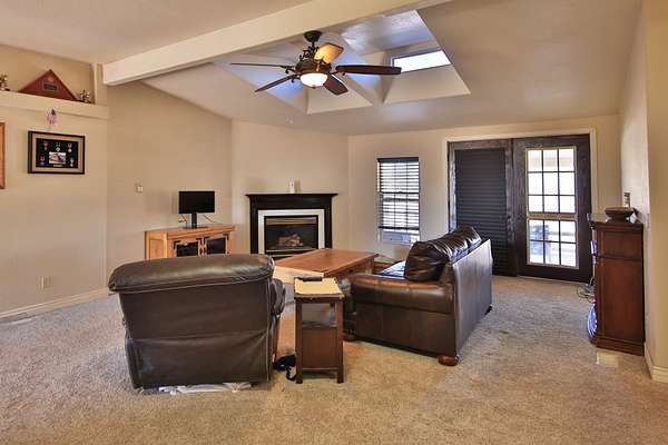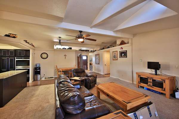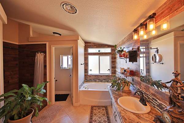 Master bedroom with large closet and mirrored sliding doors. Luxury bath with deep soak jet tub, walk in tiled shower, his and her vanity with sit down area. Behind sliding mirrored doors find a walk in closet with dressing area. Other two bedrooms with large closets. Full bath with tiled tub shower, vanity. Add the ceiling fans, unique light fixtures, vinyl/carpet/tile flooring throughout, evaporative cooler, 2 forced air furnaces, 2 hot water heaters, in this well designed floor plan to create a flow for a comfy lifestyle.