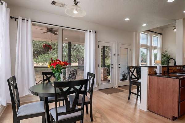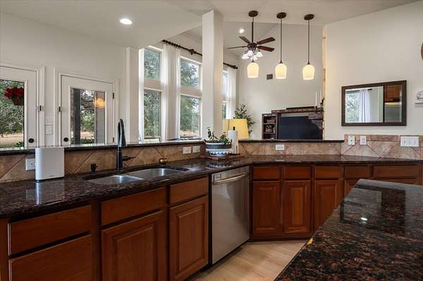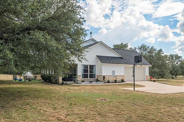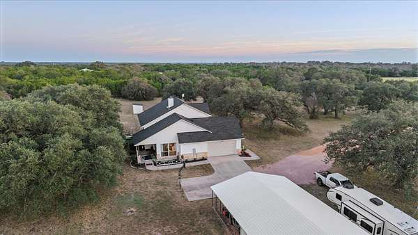 Experience peaceful Texas living on 10 private acres surrounded by scenic views and majestic oak trees. A gated entrance with an automatic opener welcomes you into this beautiful property featuring a 4-bedroom home with an office, 2.5 bathrooms, and an attached 2-car garage. Inside, soaring ceilings with floor to ceiling living room windows and a rock fireplace create a warm, inviting living space. The kitchen offers abundant storage including a custom spice drawer, new appliances within the last 3 years--stove, convection microwave, oven, and dishwasher--and a large under-stair pantry. The spacious primary suite on the main level features a walk-in shower with bench seating and a bright, oversized closet. Enjoy thoughtful updates completed in August 2025: upgraded LVP flooring with transferable warranty, interior and exterior paint on all buildings, new fixtures and toilets in all baths, and a 50-year roof. The home also includes new well pump (2022), hot water heater (2025), ceiling fans, and wiring on eaves for lighting or holiday decor. Outdoors, relax on the wide front and back porches while taking in peaceful Texas sunsets with views of turkey and deer. The fenced property offers a 3-car carport with workshop space, RV hookups with 50-amp service, dog kennel, kids' play area, and a remote-entry gate with lock feature. The underground hog-wire fencing, extra-thick foundation, and flood lighting add both security and function.