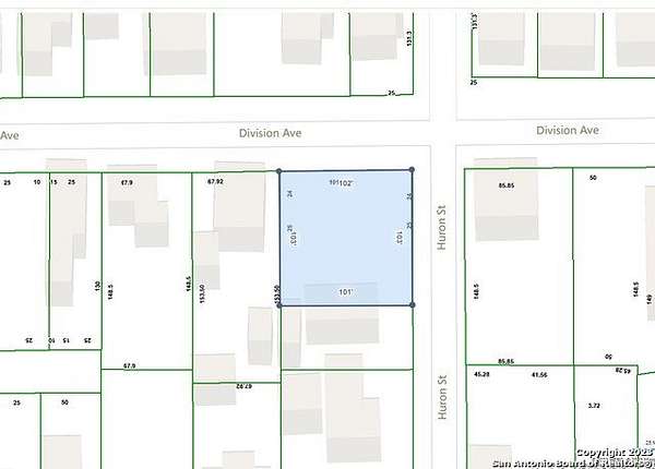 Est $756/moVacant corner lot available at the intersection of Division Ave and Huron St. Zoned R-4. Easy Access to IH-35 and minutes away from Concepcion Park and Downtown San Antonio. Property consists of 3 lots (Lots 2, 3, 4) with potential of three homes to be built per city.