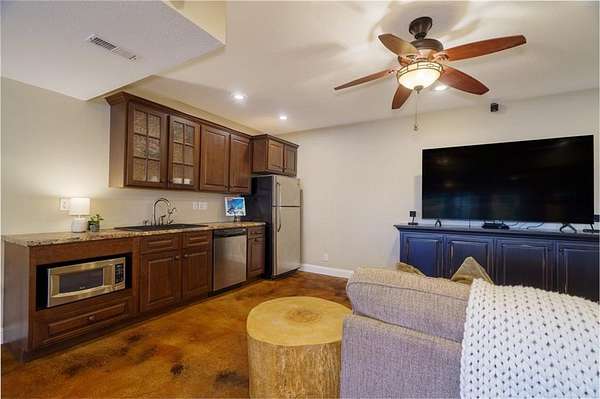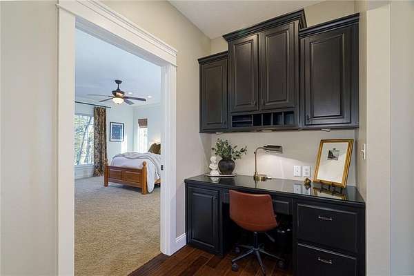 - Ceiling Fan(s), Custom Cabinets, Kitchen Island, Painted Cabinets, Pantry, Vaulted Ceiling(s)