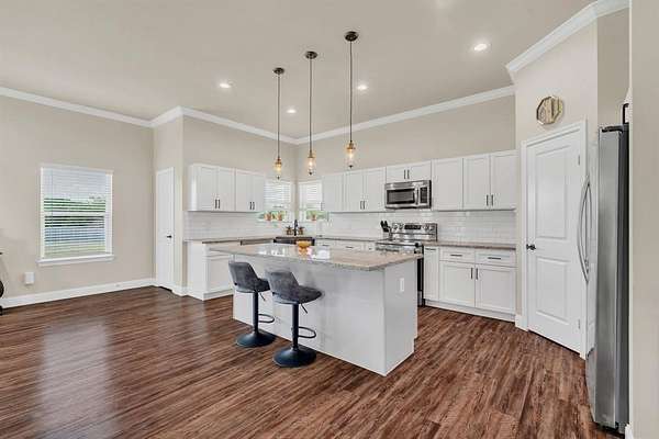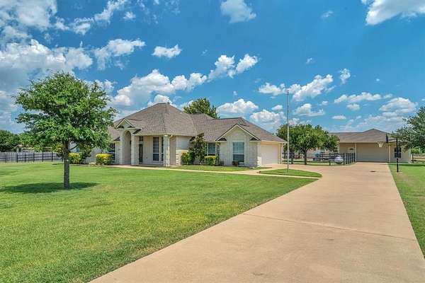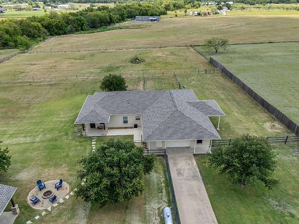 Multigenerational property on 2.5 acres offering two homes with no HOA. The primary residence features an open floor plan vaulted ceilings and tons of natural light. A formal dining room welcomes you upon entry. The family room offers a wall of windows overlooking the backyard, built-in storage, and ceiling fan. The kitchen includes a breakfast bar, granite countertops, generous cabinetry, and walk-in pantry, and breakfast area. Split-bedroom layout ensures privacy for the primary suite with a bank of large windows overlooking the backyard, vaulted ceilings, and ensuite bath with dual sinks, vanity, jetted tub, separate shower, and oversized horseshoe walk-in closet with built-in dressers and shelves for shoes. Guest bedrooms are adjacent to the full guest bath at the front of the home. A cedar-covered patio overlooks the backyard with firepit and stone paver walkway leading to the guest home. The guest home includes an open living area with kitchen, island, wine fridge, granite countertops, and abundant storage. The primary bedroom offers space for a sitting area, and a large walk-in closet with a sink. Additional bedroom includes its own closet with access to the bathroom; the bathroom features dual sinks. storage in the vanity and walk-in shower. Utility room with sink, cabinets, and space for extra refrigerator or freezer completes this versatile space--ideal for extended family, college students, or guests. In guest home garage there is a storm shelter. Centrally located near restaurants, shopping, and minutes from Rockwall, Forney, and Terrell. Generac generator operates both homes and conveys with the property - propane tank is used only for generator.