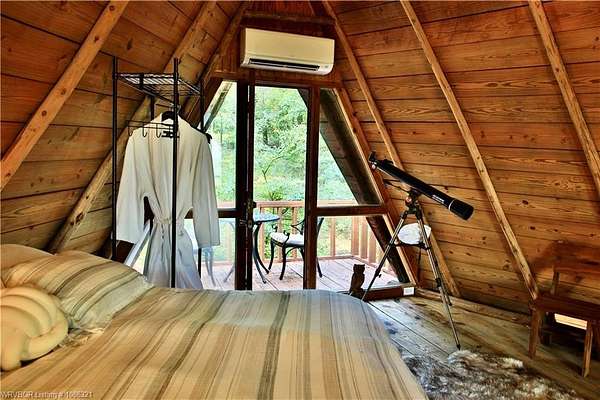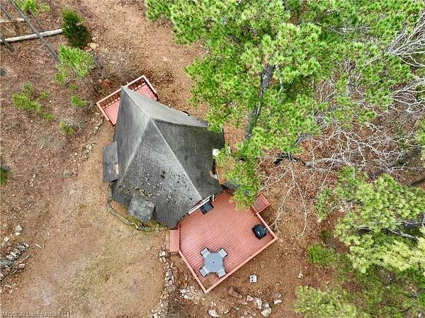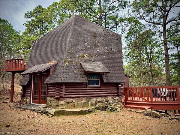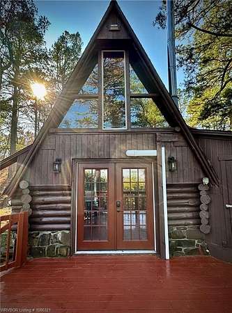A rare investment opportunity, this one-of-a-kind custom hexagon lodge cabin in Red Oak, Oklahoma offers exceptional potential as a short-term rental, Airbnb, or unique mountain-side vacation retreat. Situated on 3.32 private, wooded acres along a well-maintained county road, the cabin is perched on the mountainside with mountain views, abundant pine trees, and a peaceful, secluded setting guests actively seek. The thoughtfully designed interior features unique real stone flooring, a loft bedroom and one full bath, and extensive renovations throughout completed in 2023 and 2025. The fully remodeled kitchen showcases custom all-wood soft-close cabinetry, quartz countertops, new appliances, new interior walls, and updated PEX plumbing and new electrical. The bathroom includes a custom vanity with soapstone countertop and new fixtures, complemented by new lighting throughout the cabin. Additional upgrades include two mini-split HVAC systems, a tankless hot water heater, new windows and doors including a picture window, a newly painted custom deck, freshly painted log siding, a new exterior skylight dome, and a newly installed wood stove--ideal for cozy mountain evenings. Quiet, private, and truly one-of-a-kind, this turnkey property is perfectly suited as an income-producing Airbnb, weekend escape, or personal retreat, conveniently located near public hunting lands, Robbers Cave State Park, the Talimena Scenic Byway, the Ouachita National Forest, and nearby shopping and dining. Unique properties like this rarely come available--schedule your private showing and explore the investment and lifestyle potential this mountain retreat has to offer.