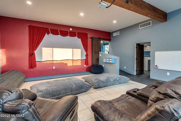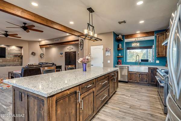 - Beamed Ceilings, High Ceilings, Kitchen Island