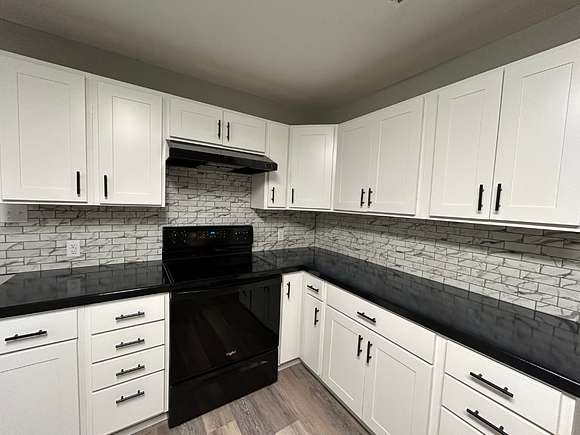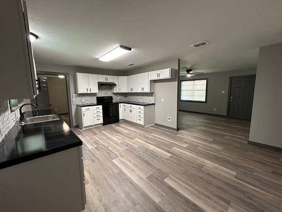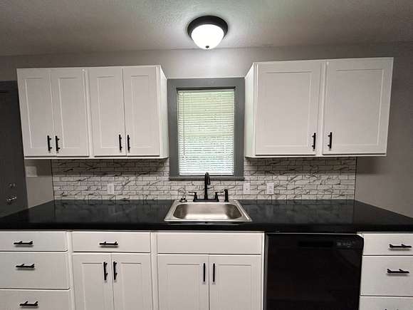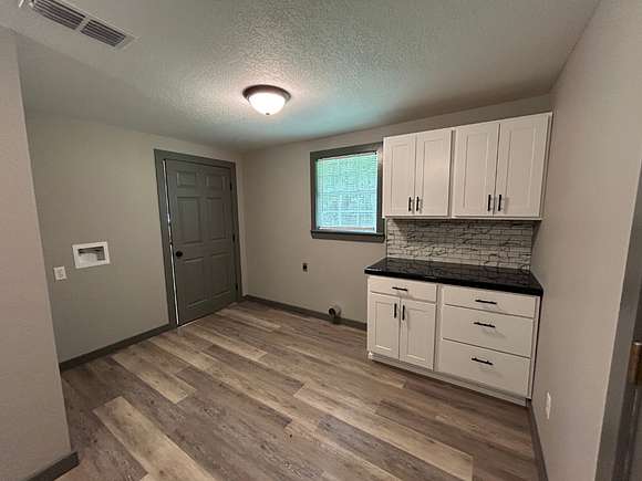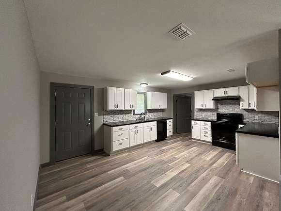 The interior is completely remodeled in a modern farmhouse style with vinyl plank flooring, freshly painted walls throughout, and a white and black kitchen with new countertops, backsplash, and appliances. No country home is complete without a mudroom and this one is a dream: plenty of space for everyone to kick off their boots, a half bath for washing up, and ample room for an extra fridge or storage space.
