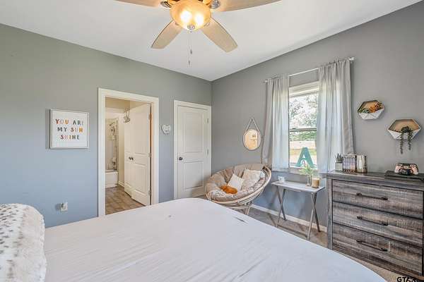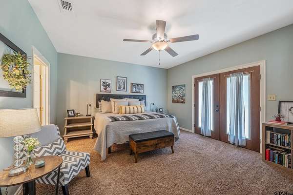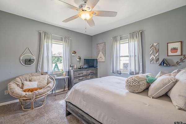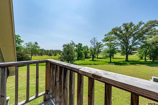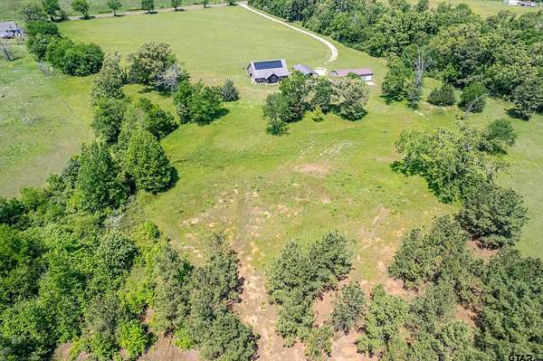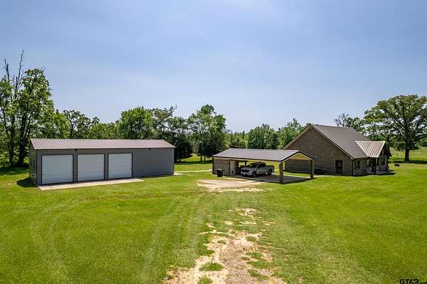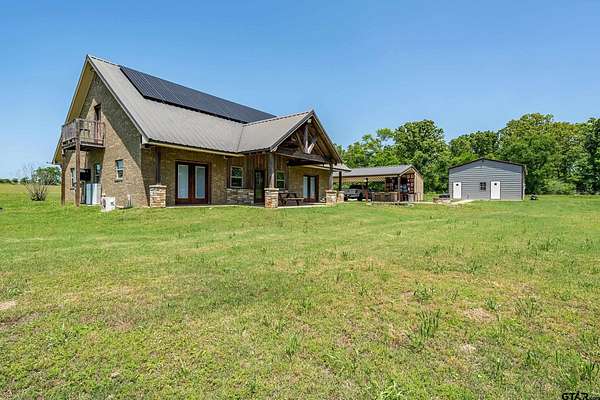 Welcome to your own gorgeous slice of East Texas! This peaceful and private 3-bedroom, 2.5-bath home sits on 10.29 beautiful acres in the desirable Carlisle ISD, offering over 2,200 square feet of well-designed living space. The open floor plan features a vaulted ceiling in the den with striking wood beams and an abundance of natural light throughout. The kitchen is a dream with granite countertops, custom cabinetry, and an island with a breakfast bar—perfect for cooking and entertaining. The primary suite is split for privacy and includes a spacious ensuite bath with double sinks, a separate shower and tub, and a large walk-in closet. A guest room downstairs offers another walk-in closet, while the third bedroom is upstairs, complete with a mini-split for added comfort. Additional highlights include a large laundry room with built-in desk space, great storage throughout, and solar panels for energy efficiency. Step outside and enjoy the stunning views, expansive outdoor entertainment area with a bar, fridge, and fire pit, plus ample room to garden or raise animals. The insulated shop is a true bonus—equipped with electricity, four roll-up doors, and plumbing for water. With a 2-car carport, scenic surroundings, and a location just minutes from Henderson and under an hour to Tyler, this one truly has it all. Come See! Come Buy!
