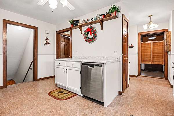 - Built-In Desk, Ceiling Fan(s), Countertops-Laminate, Deck Covered, Dishwasher, Disposal, Dryer Hook Up Electric, Firepit, Formal Dining Room, Foyer Entry, Garage Door Opener, Landscaped, Main Floor Laundry, Main Level Bedroom Suite, Refrigerator, Stand Up Shower, Sump Pump, Tub/Shower Combination, Washer Hook-Up, Water Heater Electric, Water Softener-Owned, Window Treatment-Blinds