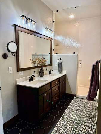 The main level spans 2,280 square feet and features 10-foot ceilings, creating an open feel throughout. The heart of the home is a beautiful kitchen with granite countertops and custom cabinetry, opening onto the spacious main living area. The master suite includes a spacious walk-in closet and a luxurious bathroom that comes furnished with a double vanity sink, a soaker tub, and a 4 ft x 7 ft Onyx walk-in shower. Two additional bedrooms, full bathroom, dining room, home office, and mudroom complete the main level.