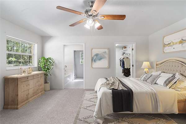 - Ceiling Fans(s), Eat-In Kitchen, Kitchen/Family Room Combo, Living Room/Dining Room Combo, Open Floorplan, Primary Bedroom Main Floor, Split Bedroom, Thermostat, Walk-In Closet(s)