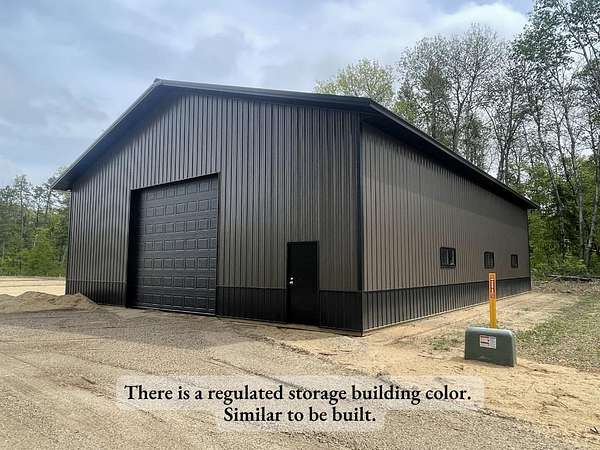 Lot size is 48' x 64'. All building widths to be 48' and built to the front lot line facing the access drive. Minimum building size 48' x 48'. Maximum building size 48' x 64'. Required structure colors - see covenants. Sidewall height - 16'. Overhead door height - 14' - 18' (width and number of overhead doors are owner's choice). Service door detail - see covenants. Windows - owner's choice. The burnished brown with black trim is the required color. All units will match the color. The two 18' doors are only an option, not required. Exterior lighting - all lighting to be downward. The apron is required to be a minimum of 4' into the common area to a maximum of 18' so as not to obstruct the driveway. Outside storage - prohibited. Interior finish - owner's choice.