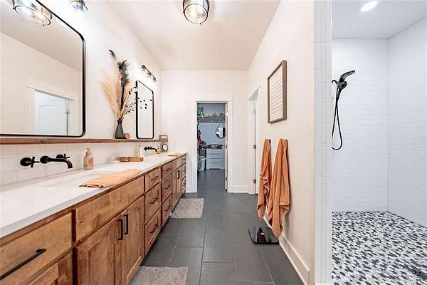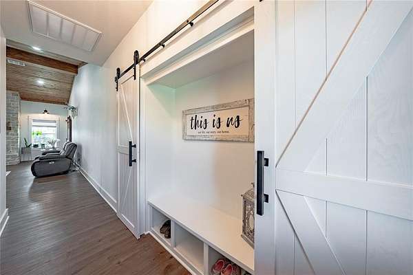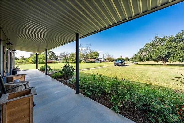 Custom-built barndominium that was built in 2023, nestled on 4 acres offers unique blend of luxury, functionality, and peaceful country living. This home features a spacious 3-bdrm, 2-bath open floor plan that seamlessly integrates modern living with comfort. The heart of the home, the kitchen boasts custom cabinetry equipped with clever hidden drawers, quartz countertops in both kitchen and bathrooms and granite countertop in the laundry room. The living room and kitchen area are enhanced with vaulted ceilings trimmed out in stained wood, creating a warm and inviting atmosphere. Two of the bedrooms share an oversized bathroom that has ceramic tile floor, while the primary suite is situated away from the other bedrooms for added privacy. The primary bedroom features a large customized walk-in closet and an en-suite bathroom with an expansive walk-in shower. Additional highlights of the home include custom Roman shades, kitchen appliances are crafted with glass finishes, and customizable color panels are available on-line. Relax on the spacious 8 ft wide front porch, a generous 10 ft wide back porch.