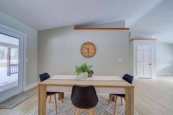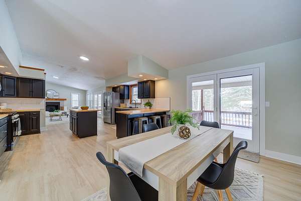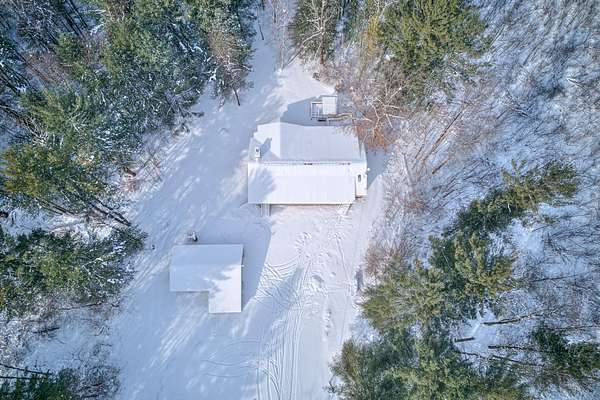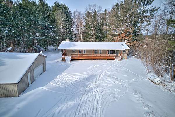 Beautifully remodeled ranch on 8.1 private wooded acres with frontage on Four Mile Creek, offering access to all-sports lakes including Lincoln Lake. Updated in 2025, the home now features five bedrooms, providing flexible living space for guests, home offices, etc. Enjoy outdoor living from the covered front and rear porches, ideal for relaxing or entertaining. The rear porch/deck is accessible from the dining room, living room, and primary bedroom. Inside, the home offers a bright, open layout with a spacious kitchen featuring an island/snack bar. The finished lower level offers excellent space for recreation, entertaining, or storage. Additional amenities include an unattached pole barn for vehicles, equipment, or recreational toys, plus an additional storage shed. A rare opportunity combining privacy, water access, and recent updates this property must be seen to be fully appreciated.
