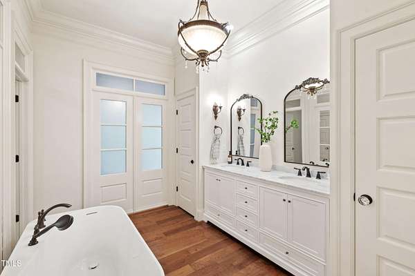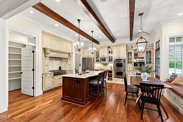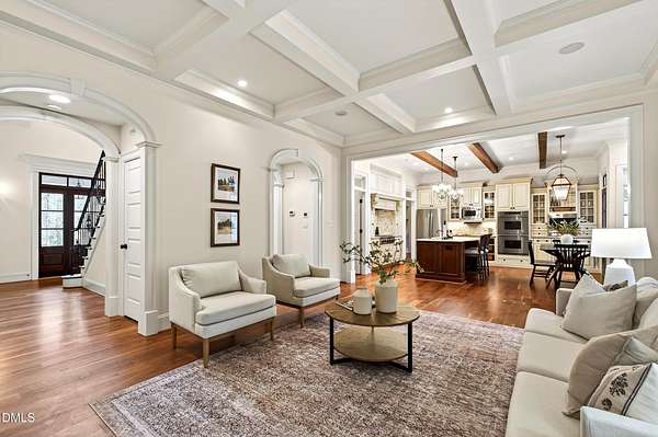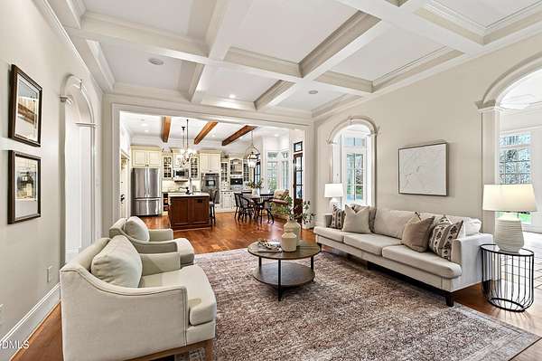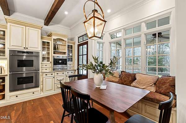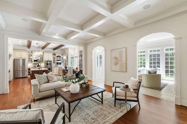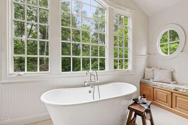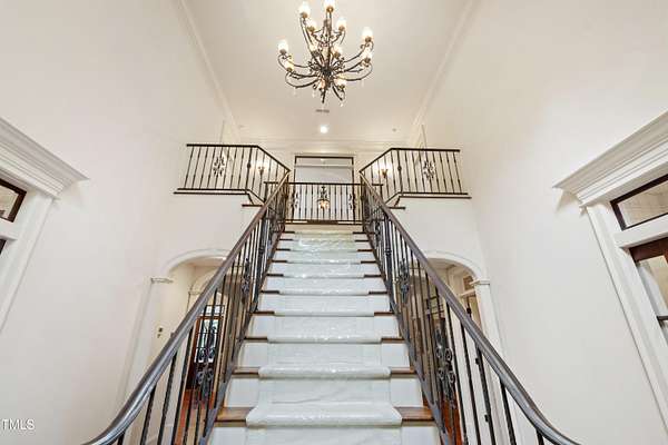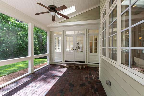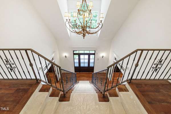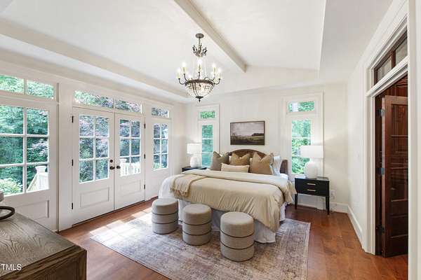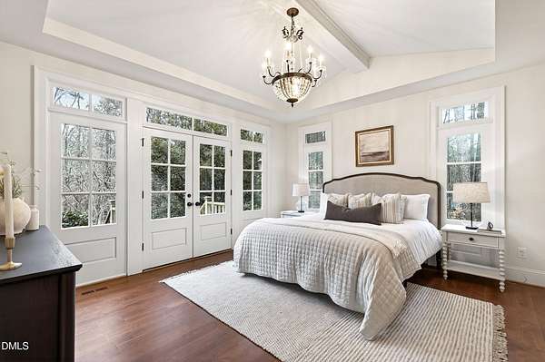 Welcome to an unparalleled custom-built masterpiece, gracefully situated on 3.25 serene acres within The Shire, an exclusive enclave of only nine homesites spanning over 90 wooded acres. Enjoy the tranquility of a private estate, mere minutes - just four miles - from the vibrant heart of Downtown Chapel Hill, UNC Hospital, and Carrboro. Step inside and be captivated by a residence that has been meticulously maintained and thoughtfully designed. Grand vaulted ceilings, dazzling chandeliers, and a magnificent staircase immediately evoke a sense of refined opulence, while an abundance of bright, open windows bathes the interior in natural light. The gourmet kitchen is a chef's delight boasting Silestone countertops, gas range, a double oven, a generous walk-in pantry, a built-in Miele coffee machine, and a discreet butler's pantry - making entertaining an absolute breeze. Memorable gatherings will be a delight to host in the separate formal dining room. A recently added main-level primary suite features vaulted ceilings, private wooded views, an elegant primary bathroom with a walk-in shower, large soaker tub, and an expansive walk-in closet. The cozy sitting room with gas fireplace and plentiful storage possibilities sets the perfect tone for a relaxing oasis. The bright sunroom provides a picturesque vantage point, overlooking your sprawling private lot and the inviting in-ground pool. Upstairs, a second main suite truly defines sanctuary with a cozy fireplace, leading to a bright, luxurious bathroom appointed with both a rejuvenating walk-in shower and a deep soaker tub. Two additional spacious bedrooms and a versatile bonus room offer endless possibilities for recreation, a home theater, a private gym, or additional personalized living space. Outside, the fenced backyard is an entertainer's paradise, complete with a heating-capable pool, and breathtaking private views. Seamless indoor-outdoor living is perfected with a charming screened back porch and an additional covered porch. Beyond its beauty, 131 Lavinia offers unmatched convenience, located directly off Highway 54 for swift access to local hospitals, UNC, Chapel Hill/Carrboro, and major highways. Modern amenities abound, including a comprehensive security system, central vacuum system, a fully integrated home entertainment center encompassing the entire home, a rain-sensor irrigation system, and a reliable backup generator. This residence isn't just a home; it's a lifestyle of sophistication and comfort, meticulously crafted for discerning tastes.