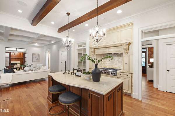 Bathtub/Shower Combination, Cathedral Ceiling(s), Ceiling Fan(s), Central Vacuum, Chandelier, Crown Molding, Eat-In Kitchen, Entrance Foyer, High Ceilings, Kitchen Island, Pantry, Primary Downstairs, Room Over Garage, Second Primary Bedroom, Sound System, Vaulted Ceiling(s), Walk-In Closet(s)