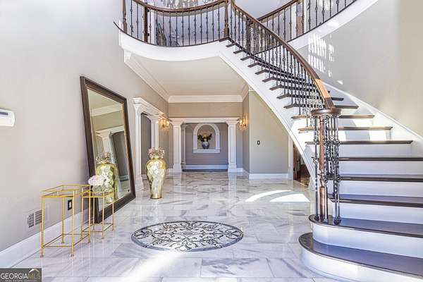This European estate is located on 4.77+/- gated acres in Tyrone, Georgia, and has undergone meticulous renovation by skilled craftsmen to present a residence suitable for both sophisticated entertaining and comfortable day-to-day living. The driveway is bordered by mature trees, with professionally landscaped gardens enhancing the property's visual appeal. Double solid wood doors introduce a marble foyer featuring a curved staircase and a crystal chandelier. Adjacent to the foyer, the right hallway leads into a wood-paneled living room with a fireplace, custom bookcase, wet bar, and triple French glass doors. A guest bedroom and bathroom are situated conveniently nearby. To the left of the foyer, the hallway provides access to a China room, a formal dining room with a crystal chandelier, and a chef's kitchen that includes an oversized island, breakfast area, snack bar, walk-in pantry, utility space, and a glass-door elevator. The rear hallway from the kitchen connects to the primary suite, a secondary staircase, the terrace level, and a half bath. The primary suite features a tray ceiling and bay window overlooking the rear grounds. The en-suite bathroom offers a garden tub, a private toilet closet with bidet, a steam shower, and dual custom closets. An adjoining wood-paneled office equipped with custom bookcases is accessible from the suite. A central four-seasons lanai, climate-controlled for year-round use, contains an indoor swimming pool, hot tub, sauna, full bar, wine closet, and a full bath and changing room with a steam shower. Upstairs, there are three separate bedroom suites, each with built-in cabinetry, window seating, and ample closet space. Additional features include elevator access, two sitting areas, and significant storage. The lower level provides extensive recreational amenities, including a tavern-style bar, full bath with shower, home theater, game room with vintage arcade games, and a regulation 10-pin bowling alley. Outside, a full sport court for tennis, pickleball, or basketball sits perfectly surrounded by lush gardens and a koi pond. The property offers privacy while remaining within convenient driving distance of Atlanta International Airport, Peachtree City, Trilith Studios, as well as various entertainment venues, restaurants, and shopping centers.