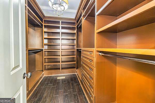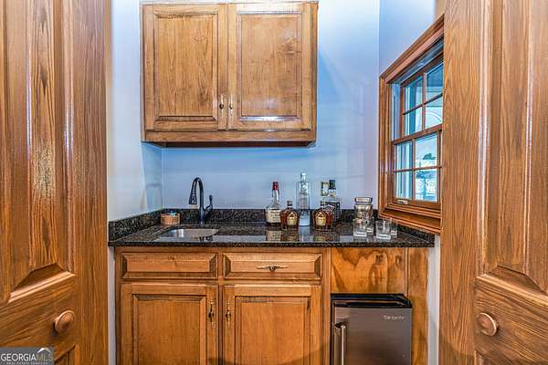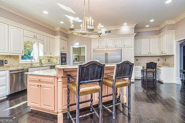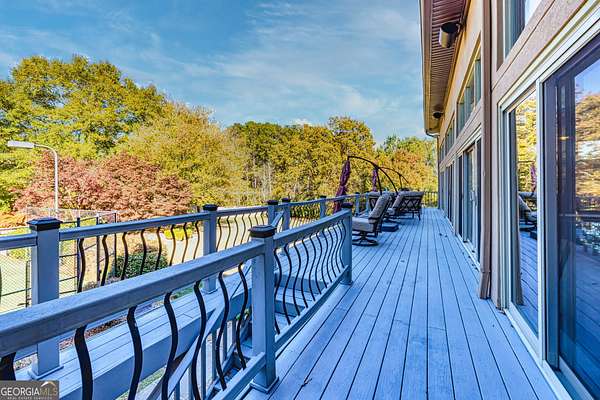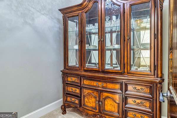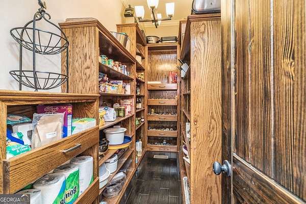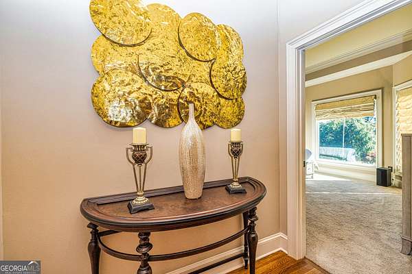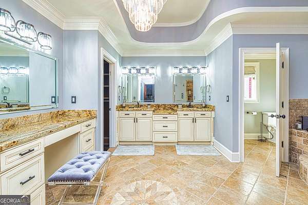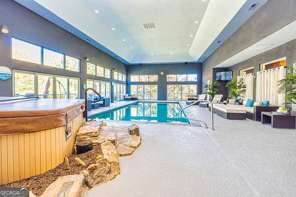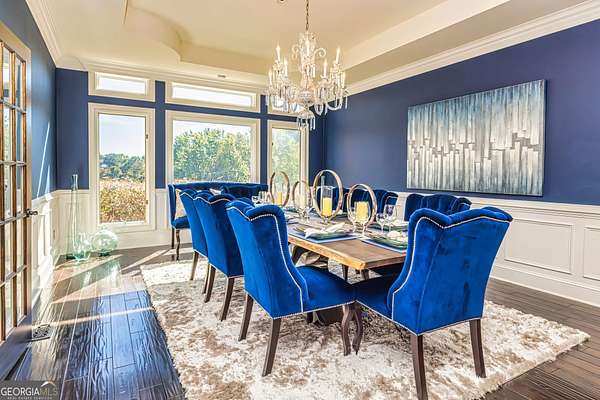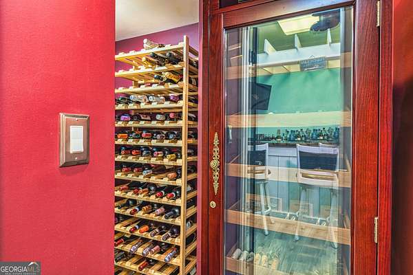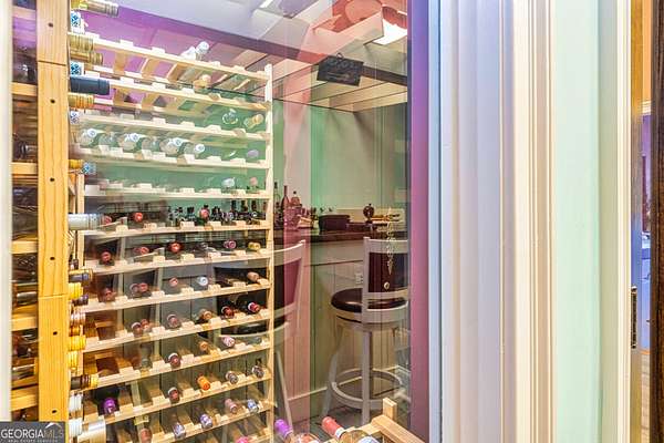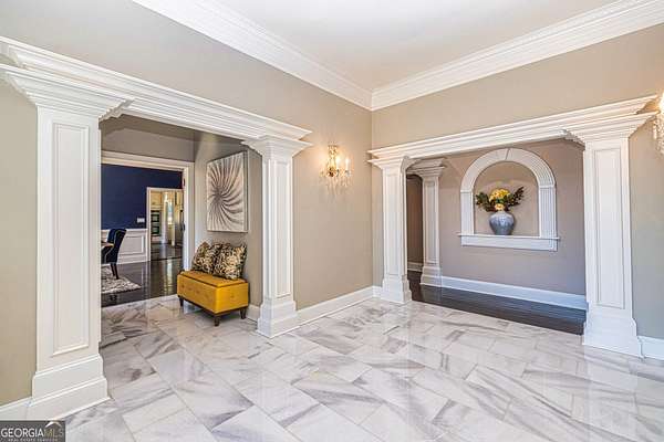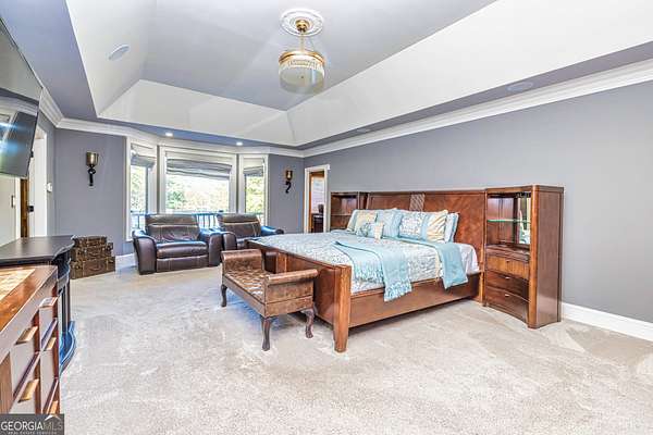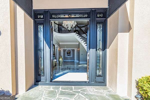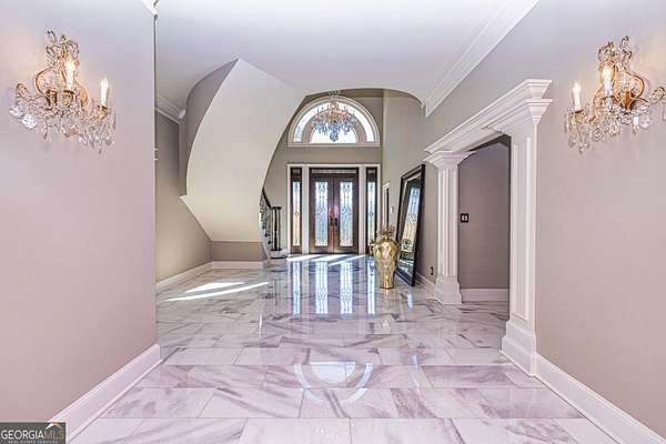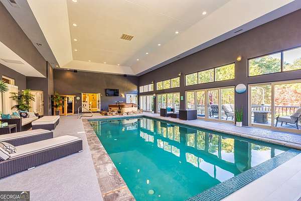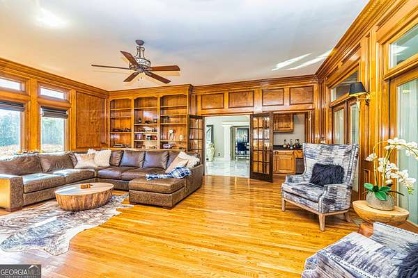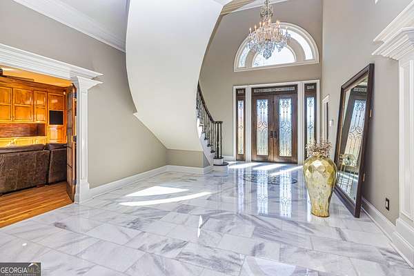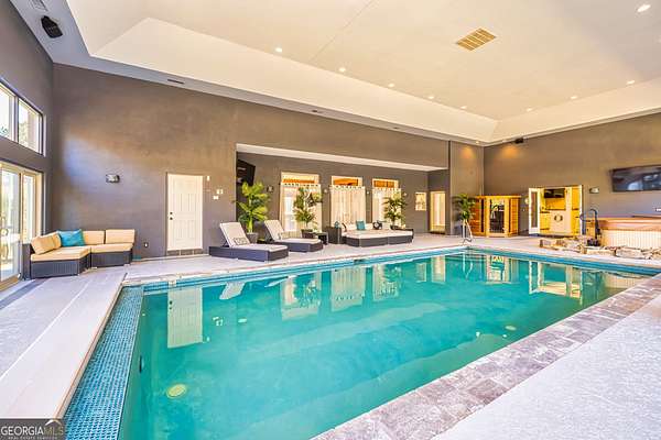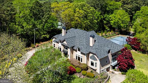This European estate is located on 4.77+/- gated acres in Tyrone, Georgia, and has undergone meticulous renovation by skilled craftsmen to present a residence suitable for both sophisticated entertaining and comfortable day-to-day living. The driveway is bordered by mature trees, with professionally landscaped gardens enhancing the property's visual appeal. Double solid wood doors introduce a marble foyer featuring a curved staircase and a crystal chandelier. Adjacent to the foyer, the right hallway leads into a wood-paneled living room with a fireplace, custom bookcase, wet bar, and triple French glass doors. A guest bedroom and bathroom are situated conveniently nearby. To the left of the foyer, the hallway provides access to a China room, a formal dining room with a crystal chandelier, and a chef's kitchen that includes an oversized island, breakfast area, snack bar, walk-in pantry, utility space, and a glass-door elevator. The rear hallway from the kitchen connects to the primary suite, a secondary staircase, the terrace level, and a half bath. The primary suite features a tray ceiling and bay window overlooking the rear grounds. The en-suite bathroom offers a garden tub, a private toilet closet with bidet, a steam shower, and dual custom closets. An adjoining wood-paneled office equipped with custom bookcases is accessible from the suite. A central four-seasons lanai, climate-controlled for year-round use, contains an indoor swimming pool, hot tub, sauna, full bar, wine closet, and a full bath and changing room with a steam shower. Upstairs, there are three separate bedroom suites, each with built-in cabinetry, window seating, and ample closet space. Additional features include elevator access, two sitting areas, and significant storage. The lower level provides extensive recreational amenities, including a tavern-style bar, full bath with shower, home theater, game room with vintage arcade games, and a regulation 10-pin bowling alley. Outside, a full sport court for tennis, pickleball, or basketball sits perfectly surrounded by lush gardens and a koi pond. The property offers privacy while remaining within convenient driving distance of Atlanta International Airport, Peachtree City, Trilith Studios, as well as various entertainment venues, restaurants, and shopping centers.