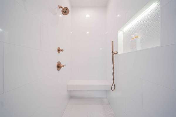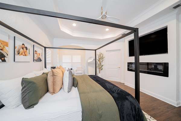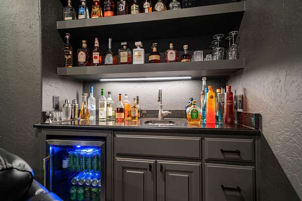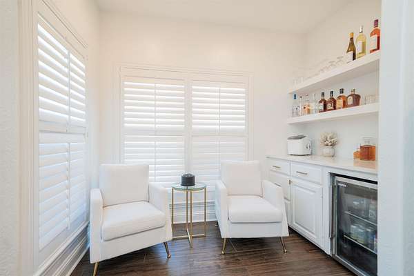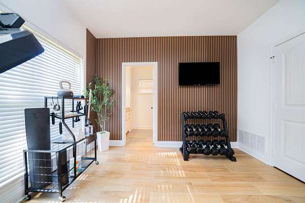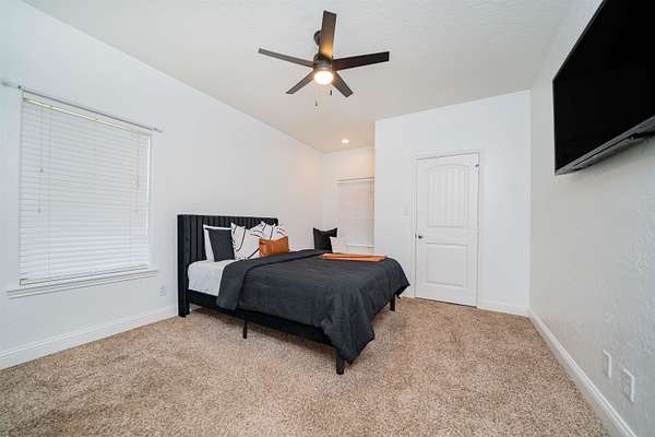 - Bookcases, Carpeting, Ceiling Fan, High Ceilings, Tile Flooring