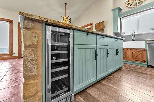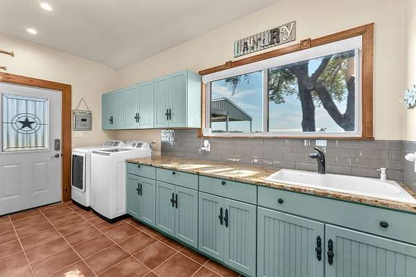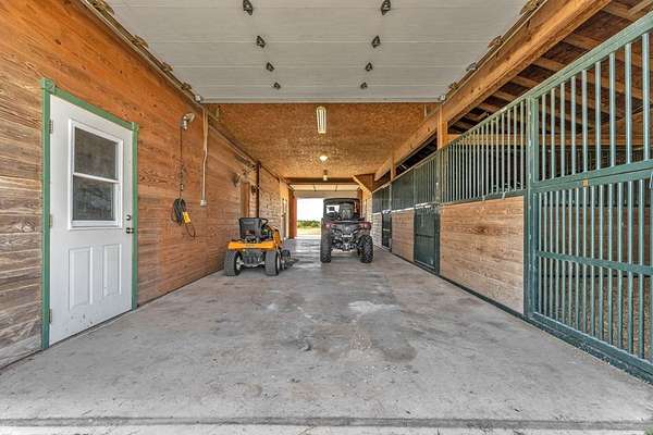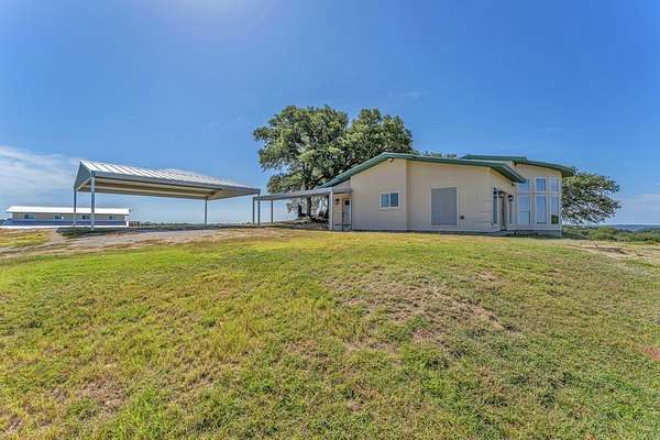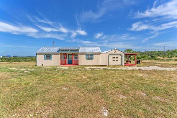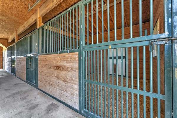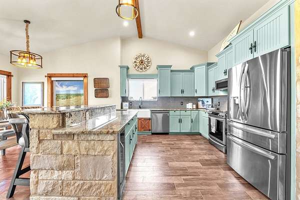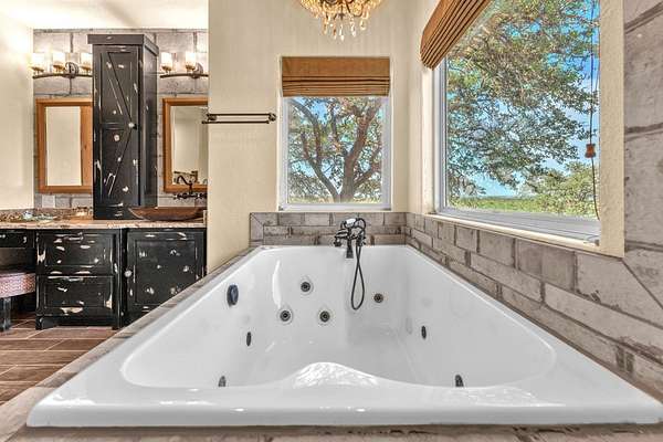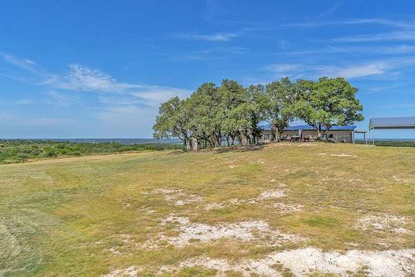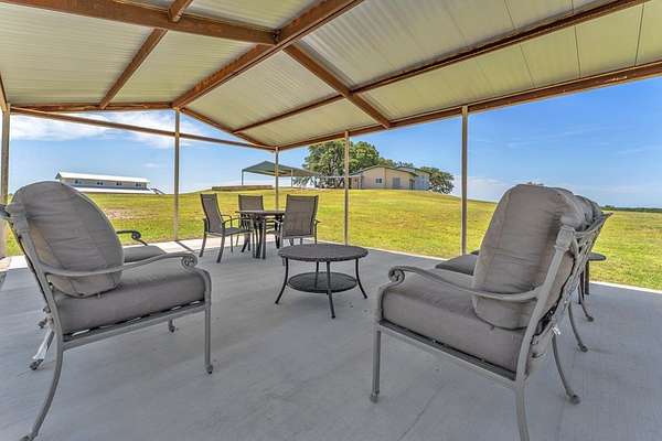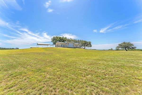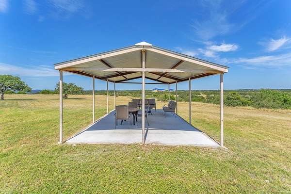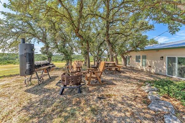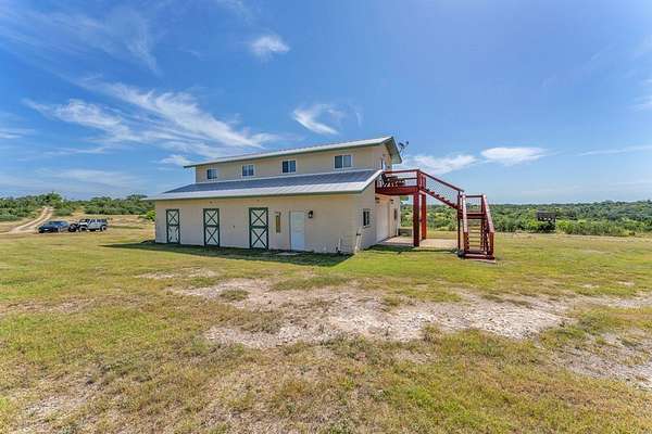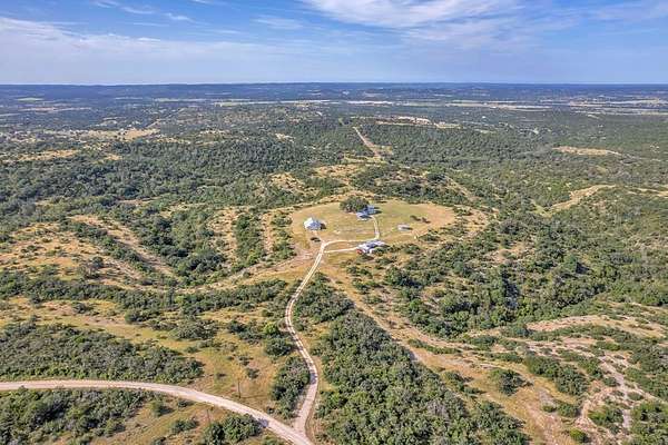 Bring your horses and gear to this scenic Hill Country retreat offering horse facilities, hunting allowed, a seasonal pond & breathtaking hilltop privacy. The main home features vaulted ceilings, tile floors, and a stone wood-burning fireplace past French doors, and the curved wall of windows with remote-controlled motorized blinds. A spacious dining area w/ oversized windows opens to a well-equipped kitchen with bar seating, wine storage & all appliances. The primary suite boasts French doors, heated jetted tub, open shower, double vanity (one sink) & walk-in closet. Bedroom 2 has French doors, two closets, and a seating nook; Bedroom 3/office has sliding doors and double closets. Guest bath features double sinks and oversized shower. The barn includes 3 stalls, 2 storage areas, a workshop, and roll-up door. Above is a fully furnished guest apartment with private entry, kitchen, and all appliances/furniture conveying. A large shop was finished out with a commercial kitchen. Extras include a gun site range, pavilion, and new metal roofs on all structures. Main home furniture is negotiable. Don't miss this unique opportunity to own a piece of the beautiful Texas Hill Country!