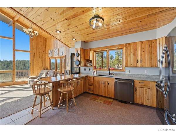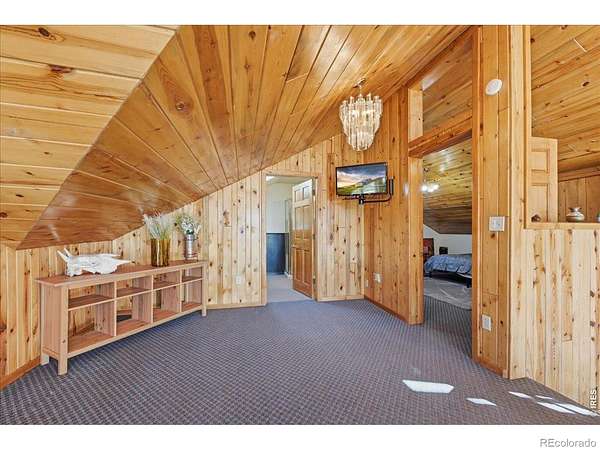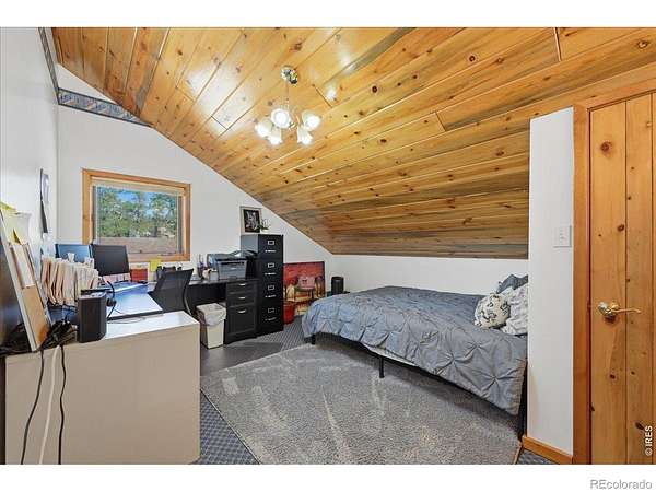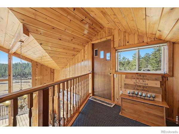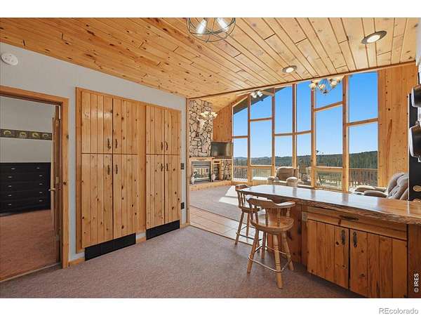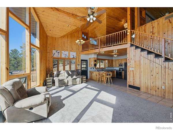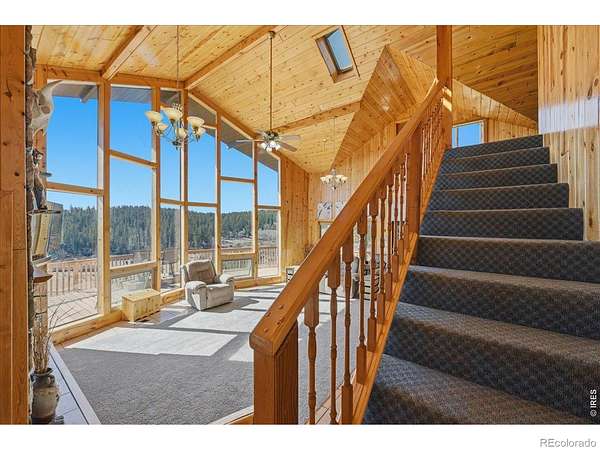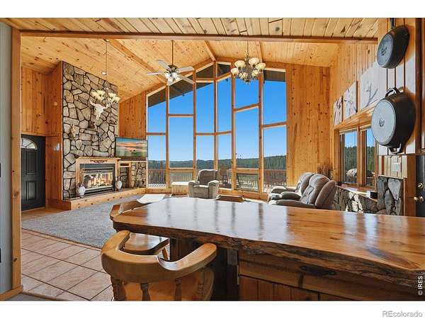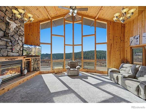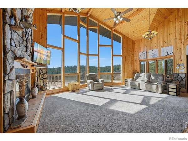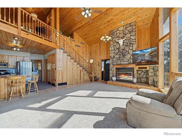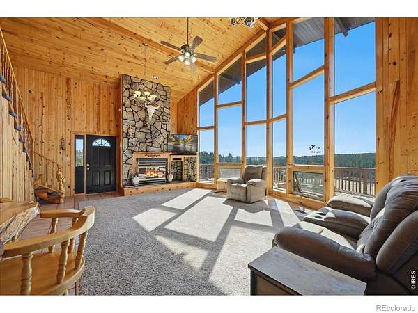 Nestled in the mountains of Northern Colorado, this amazing private home with no HOA offers outstanding views through its floor-to-ceiling windows, which also provide excellent solar gain to keep heating costs low. The 2-bedroom, 3-bath house features beautiful cabin finishes, including a floor-to-ceiling rock fireplace, knotty pine tongue and groove, built-in storage area, unfinished basement, and a spacious deck overlooking the scenery. Situated on 2.66 acres adjacent to Roosevelt National Forest, the property ensures extra privacy. Additional amenities include a two-car garage, wood shed, large storage shed, private well, full septic system, RV parking, electric, and sewer connections. Home is close to several restaurants and stores, 5 public lakes, 8 private lakes, great atv riding a short trailer tow away, hunting just steps away.