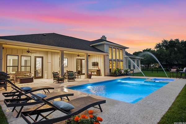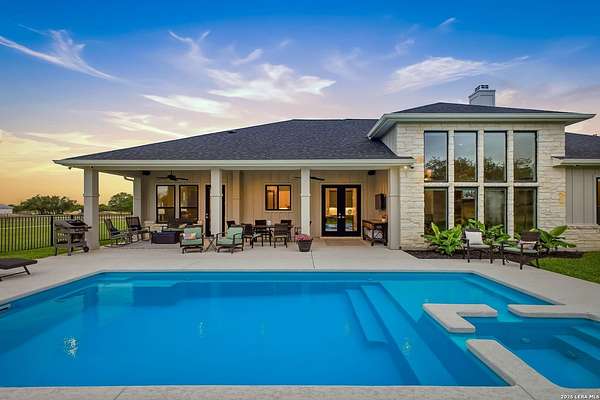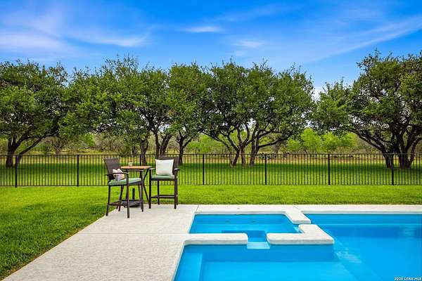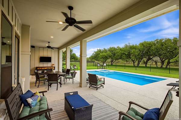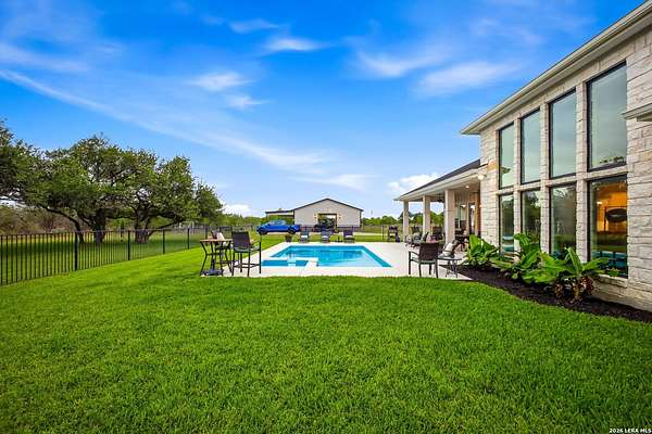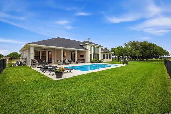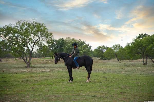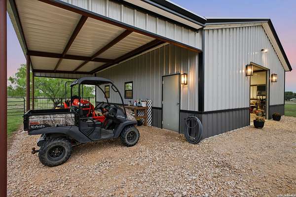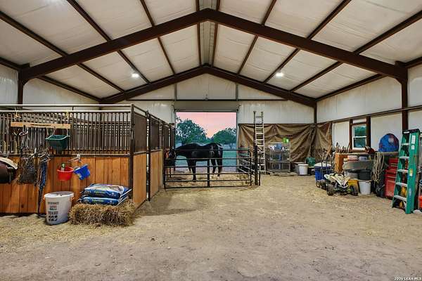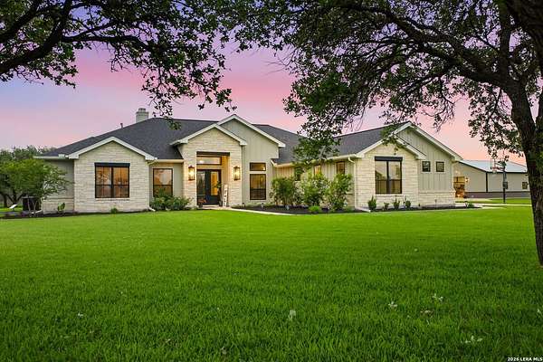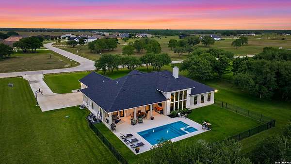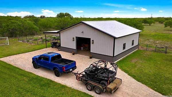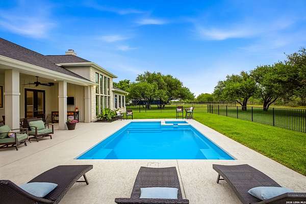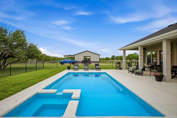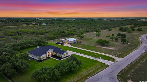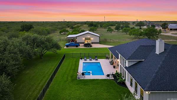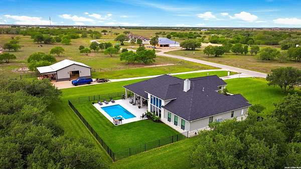 Built in 2022 and designed by Steve Klein Custom Homes, this turnkey ranchette sits on 5.01 acres in Victoria County-just 12 minutes from Victoria, 40 minutes from the Texas coastline, and approximately 2 hours from both San Antonio and Houston. Offering a seamless blend of refined living and equestrian lifestyle, the beautifully landscaped homesite is lined with mature, well-maintained oak trees to the left, while open acreage to the right provides ample space for horses to roam. The property is cross-fenced, and the fully landscaped homestead features irrigation, creating a lush, barefoot-friendly setting. The lawn is presented exactly as it is, showcasing the true condition of this meticulously maintained outdoor space. A secondary driveway leads to a 1,200-square-foot insulated metal workshop with electricity, currently configured as an equestrian retreat with two horse stalls. The building includes two pass-through roll-up doors and an attached covered carport-ideal for storing a boat, tractor, or ATV-while offering flexibility for a variety of uses. Inside, the home offers 3,496 square feet of thoughtfully designed, open-concept living space. Vaulted ceilings and large windows fill the home with natural light, creating a bright and welcoming atmosphere throughout. The spacious main living area flows seamlessly into the kitchen, making it ideal for both everyday living and entertaining, while a cozy fireplace anchors the space for cooler Texas evenings. The kitchen is designed to impress with a farmhouse sink, oversized island with seating for six, stainless steel built-in appliances, 5 burner gas cooktop, abundant cabinetry, walk-in pantry and generous counter space. Thoughtful storage is found throughout the home, enhancing both functionality and convenience. The owner's retreat offers a private getaway, featuring coffered ceilings with exposed beams and direct access to the covered patio and pool. The en-suite bath includes a beautifully designed walk-in shower, separate vanities, and a spacious walk-in closet complete with a built-in dresser and additional storage. Step outside to a resort-style backyard featuring a fully fenced saltwater gunite pool with ambient lighting and a custom water feature-perfect for relaxing or entertaining. The covered patio extends the living space outdoors and includes a built-in TV, ceiling fan, and a speaker system that flows seamlessly from the interior to the patio for year-round enjoyment. Additional highlights include two HVAC systems, two tankless water heaters, an aerobic septic system, and a Culligan water softener. A practical mudroom and laundry area are conveniently located just off the 3-car garage, adding everyday functionality and organization. Gently lived in and exceptionally well maintained, this property reflects true pride of ownership and offers a comfortable blend of modern convenience and relaxed country living. Thoughtfully designed with everything already in place, all that's left is to move in and make it your own.