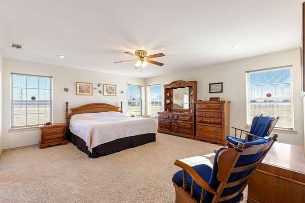 Sit on the wraparound front porch and enjoy the country views at the end of a long driveway on 6.216 acres! This 4 bedroom, 2.5 bath brick home, with over 3,000 square feet, comes with 2 living areas, 2 dining areas, and a game room. Step inside through a foyer hall where the formal dining is off to the left or easily use the room as office space. A wall of windows floods light into the main living room that is attached to a breakfast area with a door that gives you access to the covered back patio. The kitchen includes an island, double ovens, breakfast bar, cooktop, and walk-in pantry. A family room is located next to an extra large game room! Or you can close off the game room to make a 5th bedroom or convert the family room and game room into a mother-in-law suite. In addition, you also have three guest bedrooms which are split from the primary ensuite. Relax in the spacious primary bedroom which has an abundance of windows, a jetted soaking tub, separate shower, separate vanities, and a walk-in closet. Other items are a 2-car garage, recessed lights, and crown molding. If you need more land, additional acreage is availabl (for a total of 41 acres). With a great floor plan layout and additional land available, you can create the dream property you've always wanted!