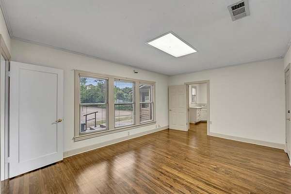The combined spaces feature a flexible layout ideal for a variety of professional uses including legal, medical, real estate, accounting, or administrative offices. Interiors include a welcoming reception area, private offices, conference space, break areas, and beautifully refinished maple wood flooring, blending modern updates with original character.