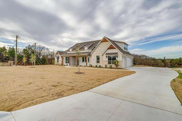 Stunning Elmwood Homes modern farmhouse spec home featuring the popular Avery floor plan on a private 1.5-acre lot in Midlothian, zoned to Heritage High School. This 1.5-story home offers 4 bedrooms, 3 full bathrooms, a dedicated office, game room, and a spacious bonus room upstairs -- providing flexible living for work, play, and guests. The interior showcases a luxurious modern aesthetic with high-end finishes throughout, soaring ceilings, and an open, flowing layout designed for both comfort and entertaining. The gourmet kitchen is a true centerpiece, featuring a large island, farmhouse sink, electric range, and abundant cabinetry, seamlessly opening into the living room with custom built-in shelving and a statement fireplace. The private primary suite is a serene retreat with a large walk-in shower, freestanding soaking tub, and an oversized walk-in closet. Enjoy outdoor living on the covered back porch overlooking your expansive acreage. With space, style, and a premier location, this exceptional new build delivers the perfect blend of modern luxury and farmhouse charm.