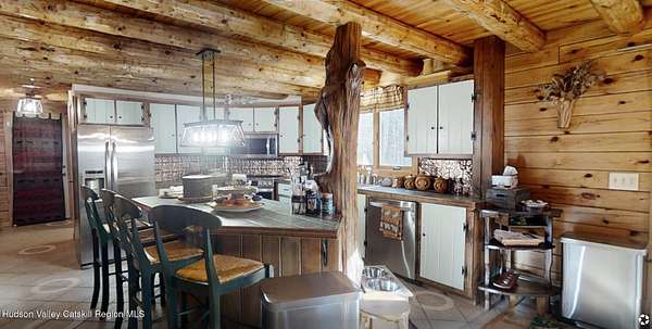 Set well back from the road behind a handsome gated entry, this modern Catskills hideaway delivers the privacy everyone wants and the volume everyone hopes for. The approach is long and quiet; the house reveals itself slowly-wrapped by trees, with sky above and room to breathe on 4.04 acres. Inside, an airy great room rises with high ceilings and broad windows that pull in daylight and treetops. A wood-burning fireplace anchors the space and gives the room an easy, year-round center of gravity. The plan flows to dining and out to the covered front porch for rainy-day coffee and a sunny deck for afternoons-simple, usable spaces that invite you to linger. There are 5 bedrooms and 2 full baths across about 2,772 sq ft, giving you comfortable proportions without wasted space. Downstairs, a full basement with a finished recreation room offers the flexible square footage every Catskills buyer asks for-think gym, studio, media, or gear room. Practical details are dialed: central air, hot-water heat, private well and septic, plus a small storage shed for tools and toys. Built in 2002 and maintained with care, the home reads clean and contemporary without trying too hard. The setting is the star. Mature trees frame the clearing, the setback is excellent, and the gate makes arrival feel intentional. Sit on the porch when it rains; take the deck when the sun breaks; let the yard be lawn, meadow, or playfield as you like. You're tucked away, yet perfectly placed for everything that draws people here-swimming holes, trailheads, ski days, and small-town dinners. If your checklist reads ''high ceilings, real privacy, proper setback, and a gated approach,'' this one does it-with the kind of ease that feels rarer every year in the Catskills.
