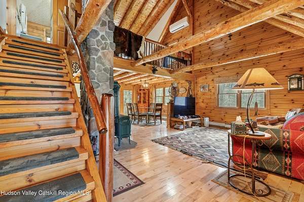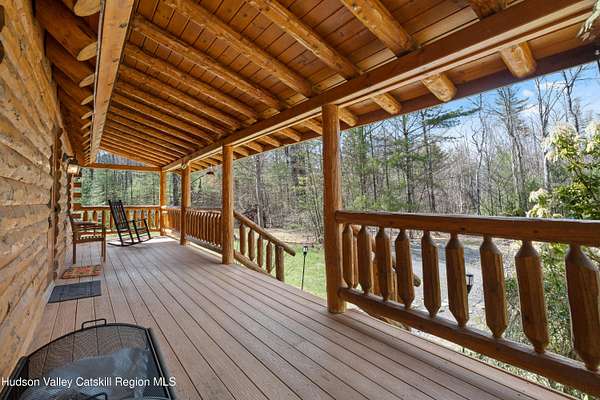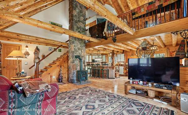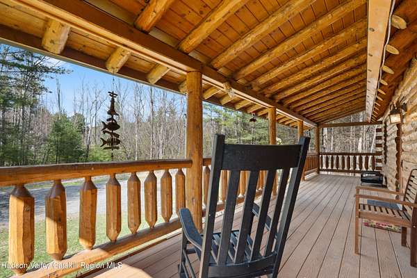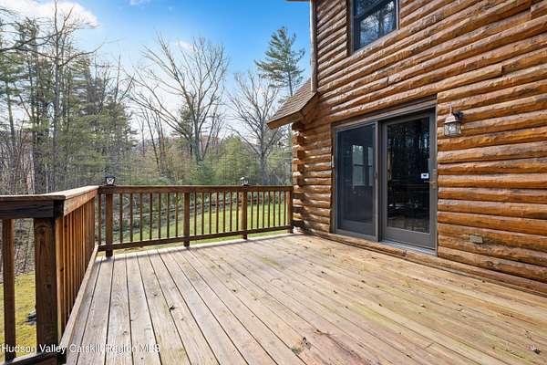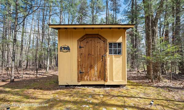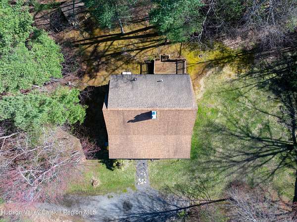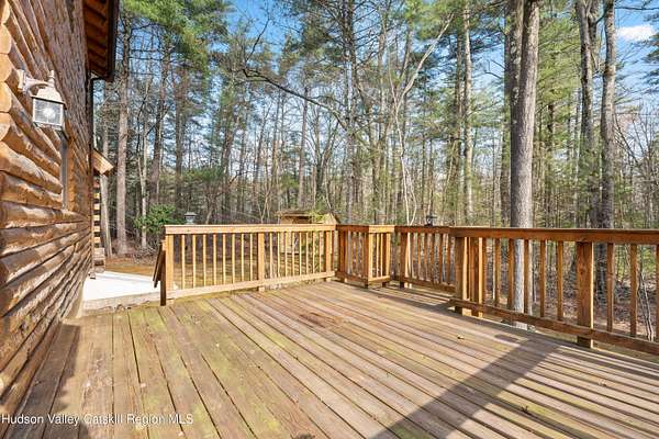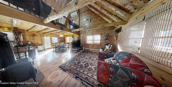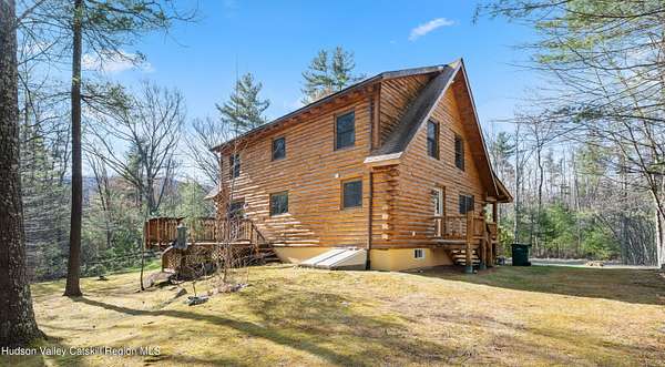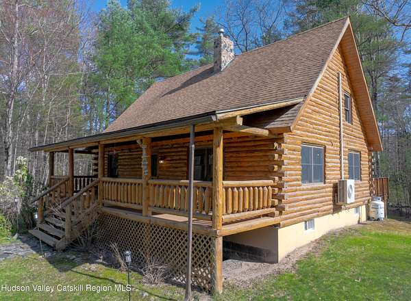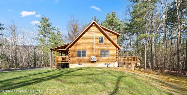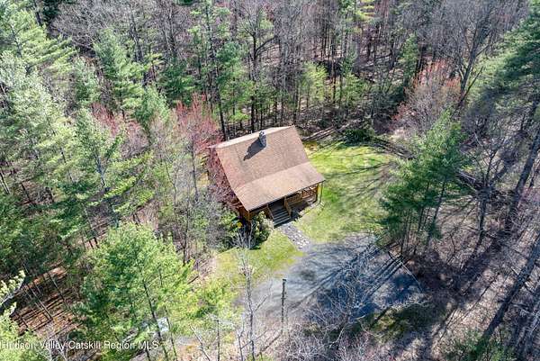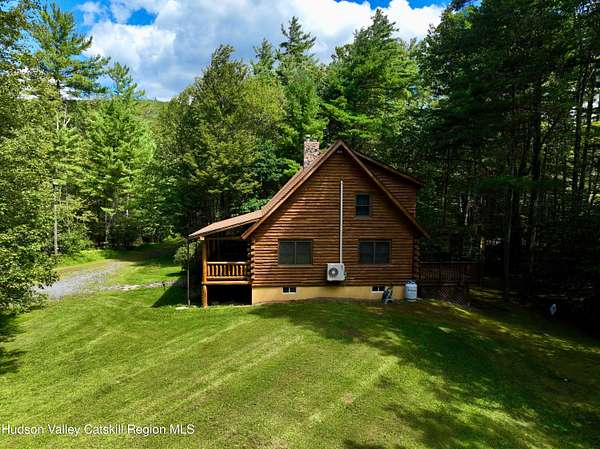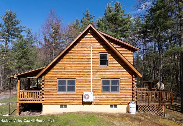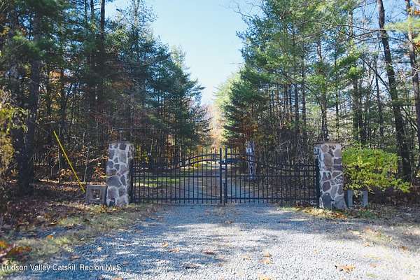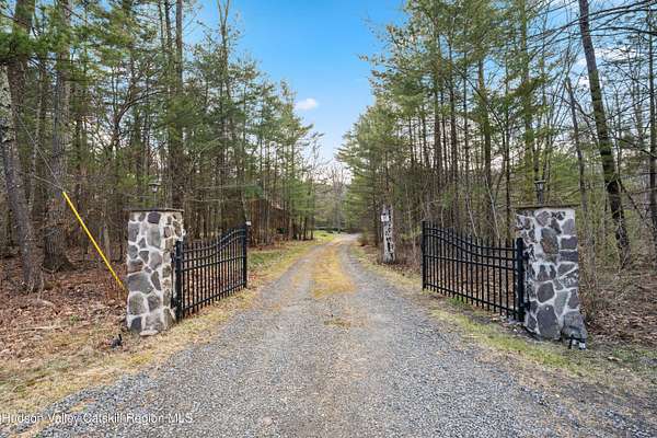 Set well back from the road behind a handsome gated entry, this modern Catskills hideaway delivers the privacy everyone wants and the volume everyone hopes for. The approach is long and quiet; the house reveals itself slowly-wrapped by trees, with sky above and room to breathe on 4.04 acres. Inside, an airy great room rises with high ceilings and broad windows that pull in daylight and treetops. A wood-burning fireplace anchors the space and gives the room an easy, year-round center of gravity. The plan flows to dining and out to the covered front porch for rainy-day coffee and a sunny deck for afternoons-simple, usable spaces that invite you to linger. There are 5 bedrooms and 2 full baths across about 2,772 sq ft, giving you comfortable proportions without wasted space. Downstairs, a full basement with a finished recreation room offers the flexible square footage every Catskills buyer asks for-think gym, studio, media, or gear room. Practical details are dialed: central air, hot-water heat, private well and septic, plus a small storage shed for tools and toys. Built in 2002 and maintained with care, the home reads clean and contemporary without trying too hard. The setting is the star. Mature trees frame the clearing, the setback is excellent, and the gate makes arrival feel intentional. Sit on the porch when it rains; take the deck when the sun breaks; let the yard be lawn, meadow, or playfield as you like. You're tucked away, yet perfectly placed for everything that draws people here-swimming holes, trailheads, ski days, and small-town dinners. If your checklist reads ''high ceilings, real privacy, proper setback, and a gated approach,'' this one does it-with the kind of ease that feels rarer every year in the Catskills.