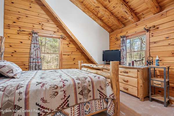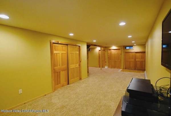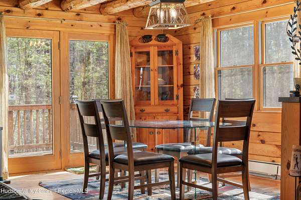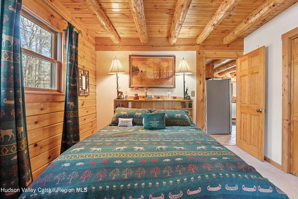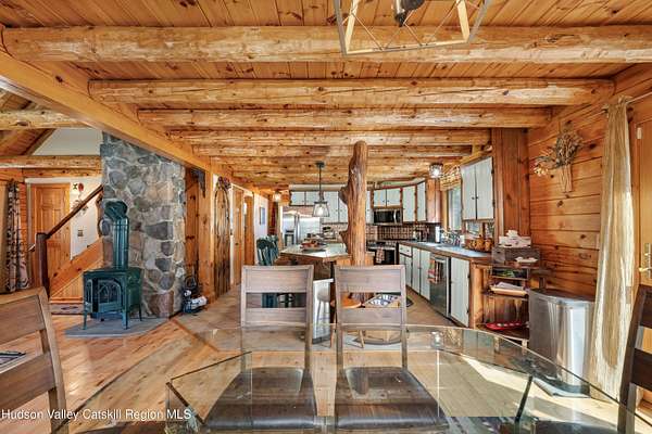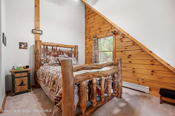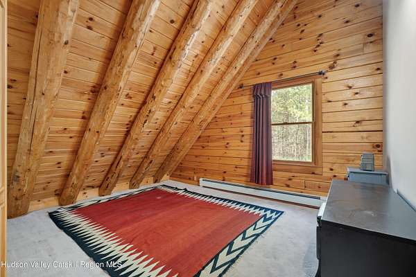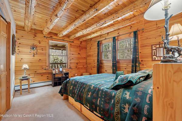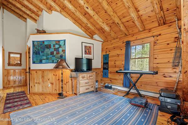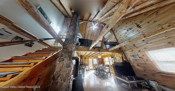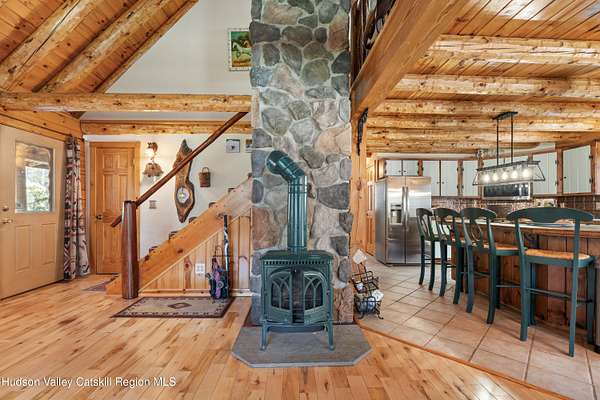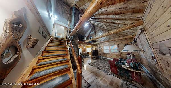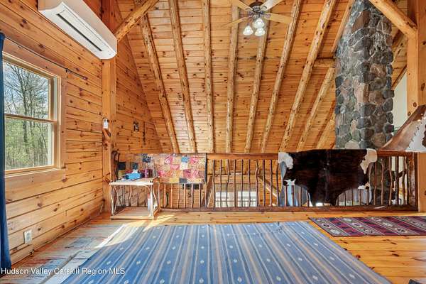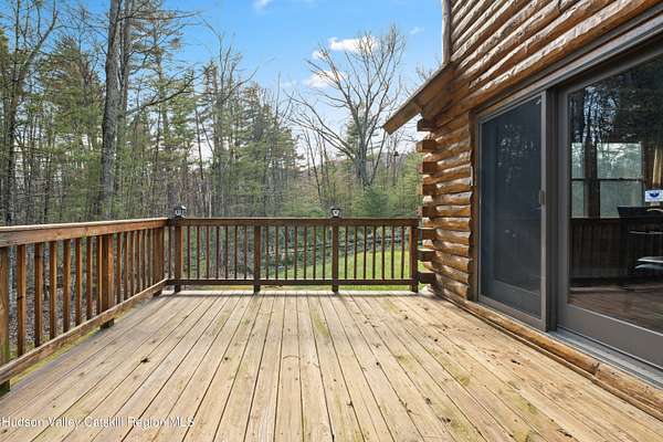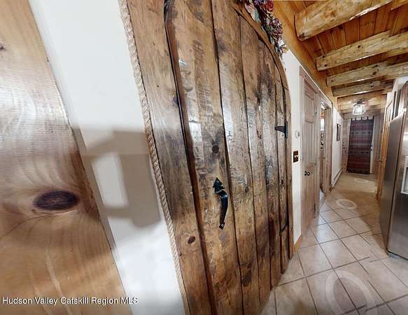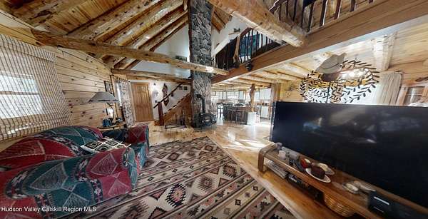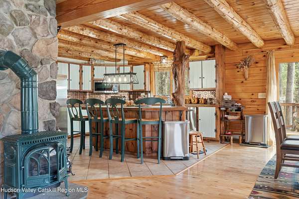 Set well back from the road behind a handsome gated entry, this modern Catskills hideaway delivers the privacy everyone wants and the volume everyone hopes for. The approach is long and quiet; the house reveals itself slowly-wrapped by trees, with sky above and room to breathe on 4.04 acres. Inside, an airy great room rises with high ceilings and broad windows that pull in daylight and treetops. A wood-burning fireplace anchors the space and gives the room an easy, year-round center of gravity. The plan flows to dining and out to the covered front porch for rainy-day coffee and a sunny deck for afternoons-simple, usable spaces that invite you to linger. There are 5 bedrooms and 2 full baths across about 2,772 sq ft, giving you comfortable proportions without wasted space. Downstairs, a full basement with a finished recreation room offers the flexible square footage every Catskills buyer asks for-think gym, studio, media, or gear room. Practical details are dialed: central air, hot-water heat, private well and septic, plus a small storage shed for tools and toys. Built in 2002 and maintained with care, the home reads clean and contemporary without trying too hard. The setting is the star. Mature trees frame the clearing, the setback is excellent, and the gate makes arrival feel intentional. Sit on the porch when it rains; take the deck when the sun breaks; let the yard be lawn, meadow, or playfield as you like. You're tucked away, yet perfectly placed for everything that draws people here-swimming holes, trailheads, ski days, and small-town dinners. If your checklist reads ''high ceilings, real privacy, proper setback, and a gated approach,'' this one does it-with the kind of ease that feels rarer every year in the Catskills.