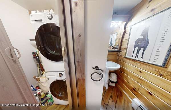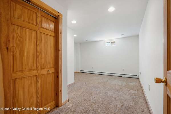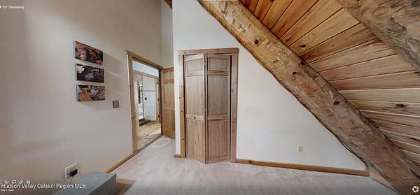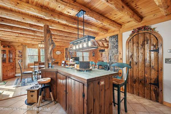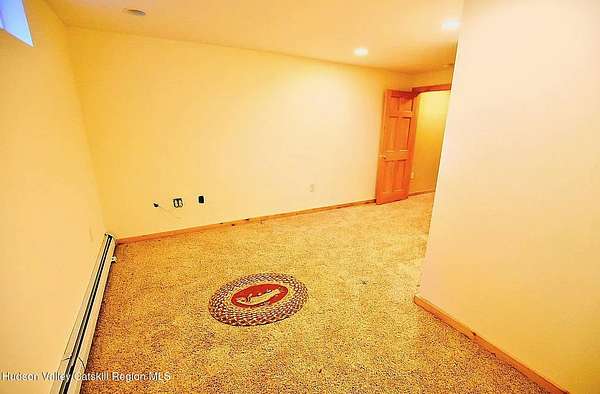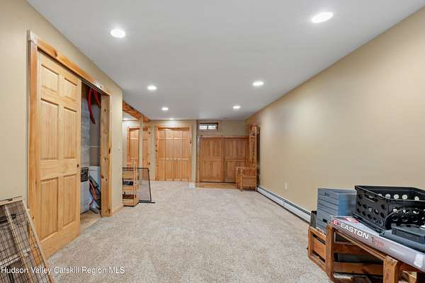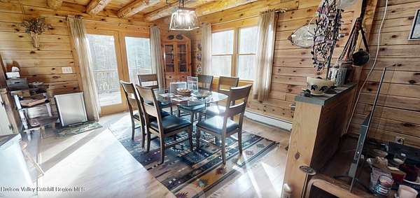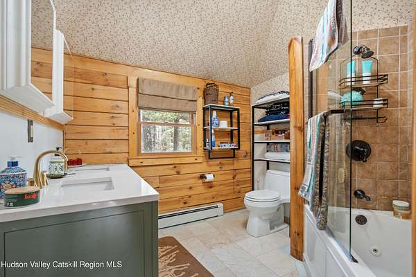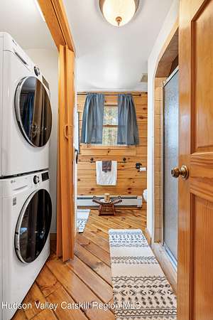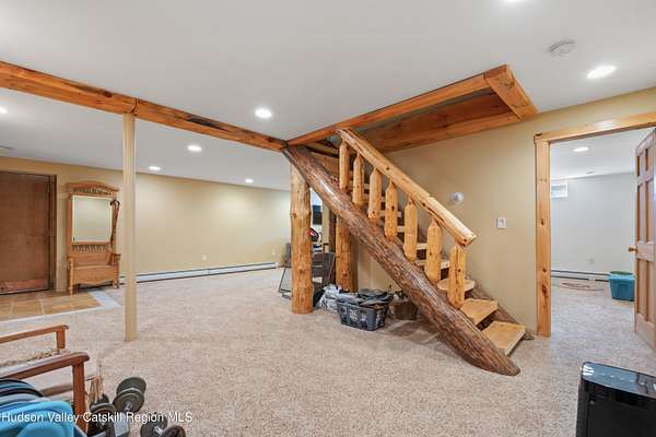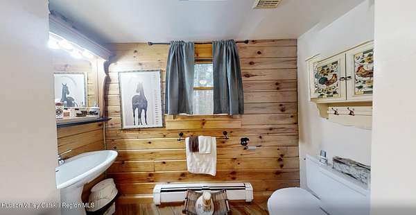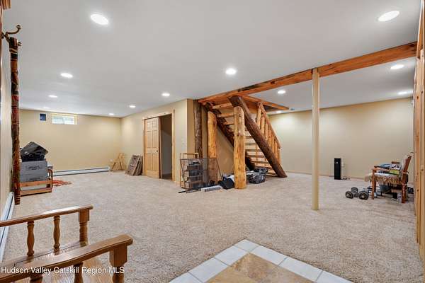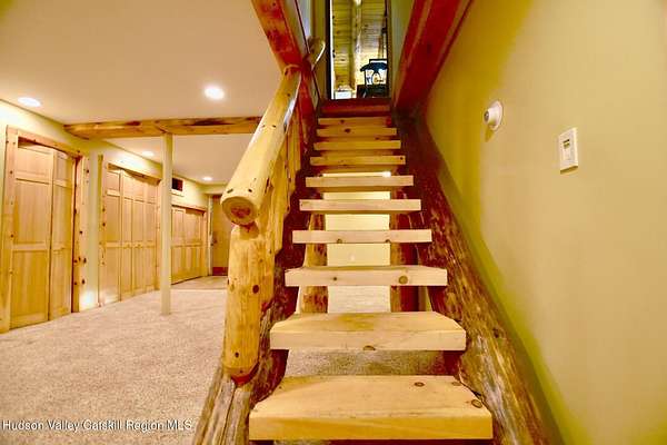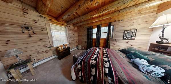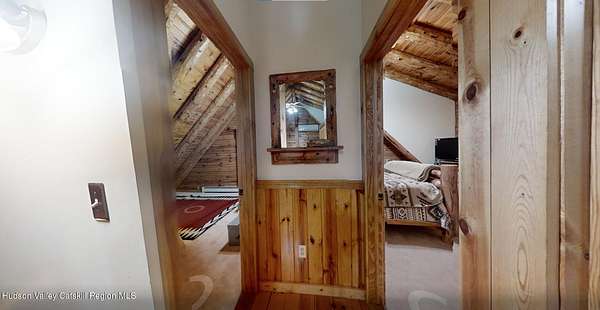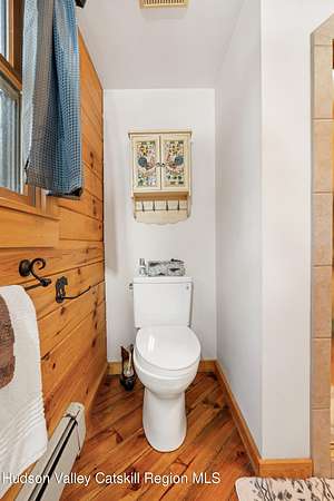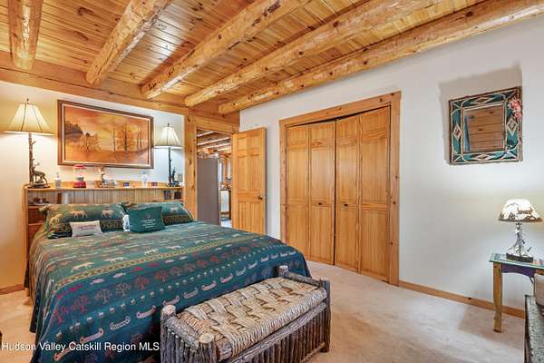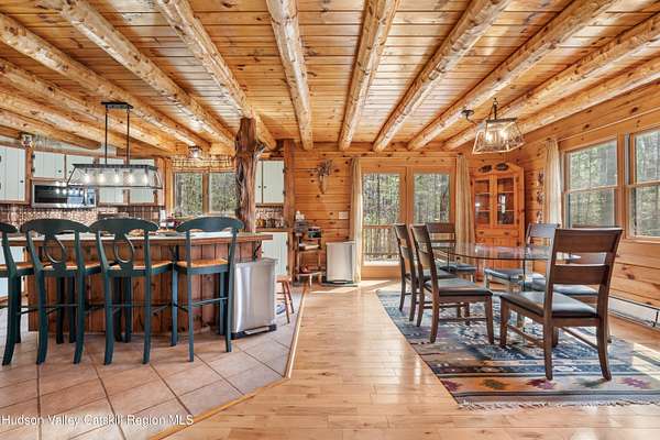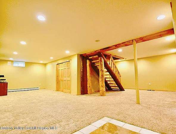 Set well back from the road behind a handsome gated entry, this modern Catskills hideaway delivers the privacy everyone wants and the volume everyone hopes for. The approach is long and quiet; the house reveals itself slowly-wrapped by trees, with sky above and room to breathe on 4.04 acres. Inside, an airy great room rises with high ceilings and broad windows that pull in daylight and treetops. A wood-burning fireplace anchors the space and gives the room an easy, year-round center of gravity. The plan flows to dining and out to the covered front porch for rainy-day coffee and a sunny deck for afternoons-simple, usable spaces that invite you to linger. There are 5 bedrooms and 2 full baths across about 2,772 sq ft, giving you comfortable proportions without wasted space. Downstairs, a full basement with a finished recreation room offers the flexible square footage every Catskills buyer asks for-think gym, studio, media, or gear room. Practical details are dialed: central air, hot-water heat, private well and septic, plus a small storage shed for tools and toys. Built in 2002 and maintained with care, the home reads clean and contemporary without trying too hard. The setting is the star. Mature trees frame the clearing, the setback is excellent, and the gate makes arrival feel intentional. Sit on the porch when it rains; take the deck when the sun breaks; let the yard be lawn, meadow, or playfield as you like. You're tucked away, yet perfectly placed for everything that draws people here-swimming holes, trailheads, ski days, and small-town dinners. If your checklist reads ''high ceilings, real privacy, proper setback, and a gated approach,'' this one does it-with the kind of ease that feels rarer every year in the Catskills.