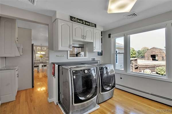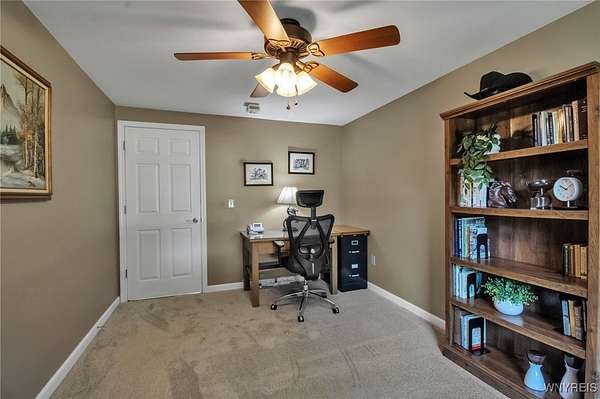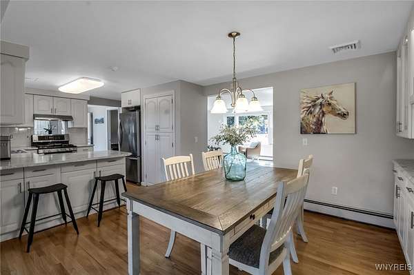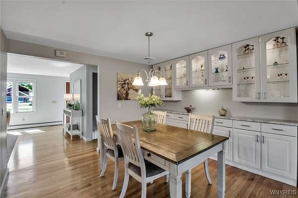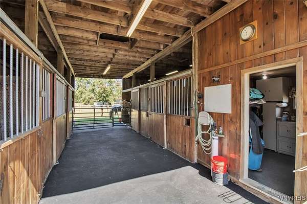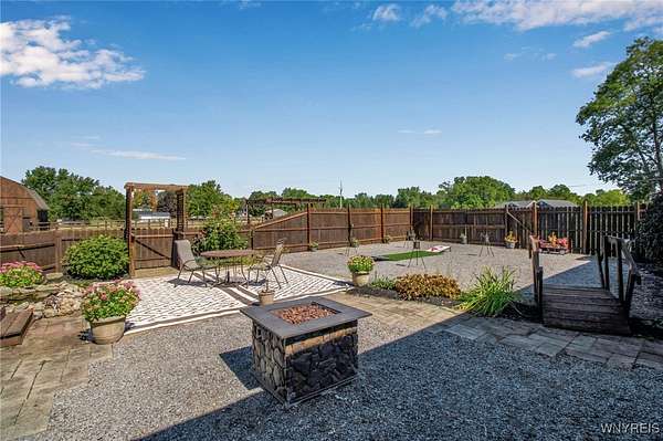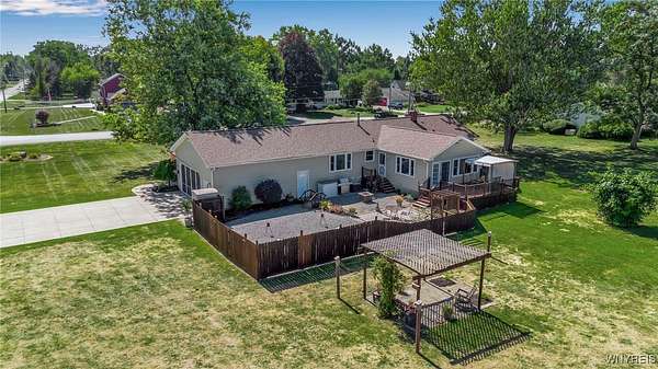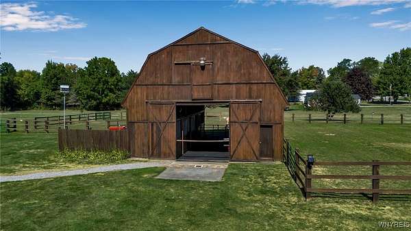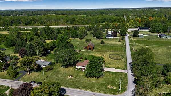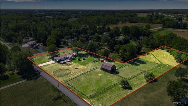 Welcome to 13118 Steiner Road; a sprawling and majestic ranch set on 4.26 beautiful acres in the Town of Newstead with highly rated Akron schools. Complete with a phenomenal horse barn with 4 stalls, tack room, three pasture fields w/solar electric fence, hay field and negotiable round pen for the burgeoning equestrian, this 4 bedroom, 3 full bath property with office/den is ideally situated on a massive corner lot, ideal for a country homestead or hobby farm for generational memories. Featuring a remodeled eat-in kitchen with bright white cabinetry, touchless faucet, tile backsplash, sideboard w/glass doors & in-cabinet lighting and refinished hardwood floors opening to the spacious living room and rear family room with gas insert FP & brand new carpeting. The main bathrm has dual vanities w/LVP flooring & skylight for natural light with a partially finished & waterproofed basement for 1100 sq ft of addt'l living space, Bilco door egress, full bathrm w/expanded shower and luxury, 8-nozzle jetted shower tree and 1st floor & basement laundry hookups. French doors lead out to the wood back deck and fenced-in courtyard patio area, perfect for entertaining, or sit under the Pergula sipping your morning coffee watching the horses roam; your own private oasis filled with character and joy. Privacy abounds with ample spacing between neighbors, RV parking, extra wide concrete driveway w/an expanded 3 car attached garage w/an abundance of shelving & incredible storage. Updates including carpet, landscaping & paint 2025, fence stained 2024, 40 yr arch. shingle roof & attic A/C 2022, Lennox boiler/water heater combo unit, some triple pane windows, all interior trim & solid core doors 2017 and much more! Beautifully appointed with breathtaking peace, enjoy evening views of paradise and the serene landscape here at your future home. Showings begin Wednesday, 9/24/2025 at 9 AM. Offers Due 9/29/2025 by 12:00 PM