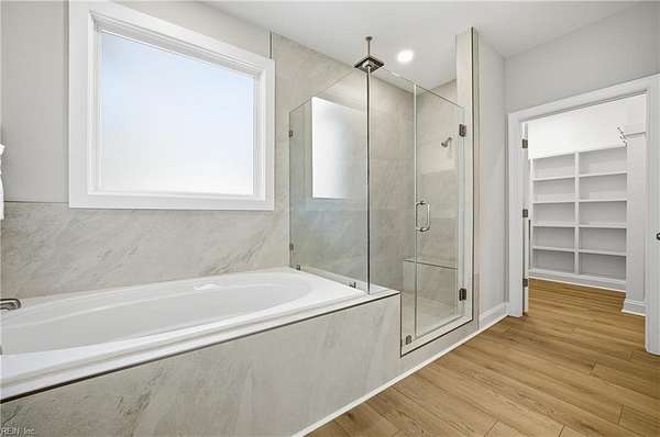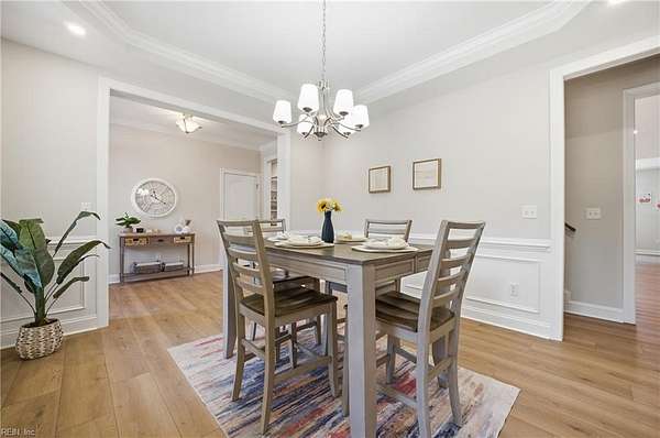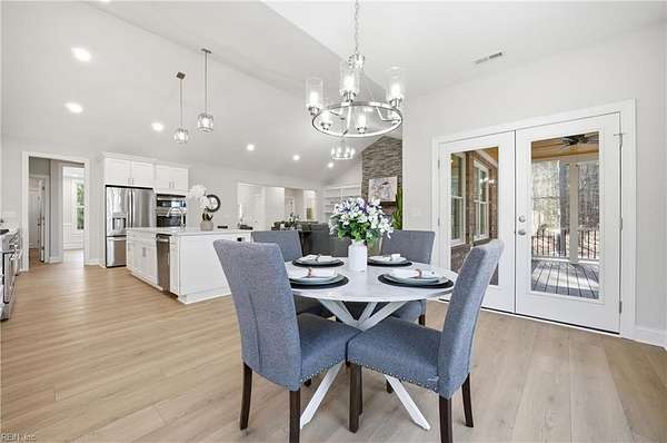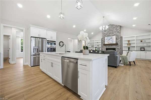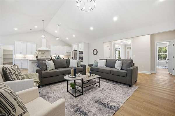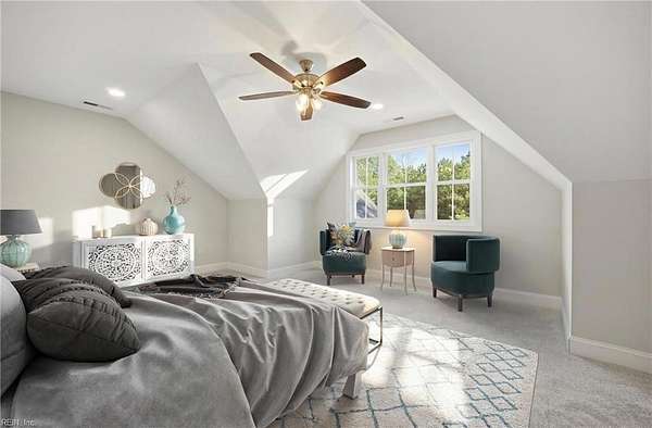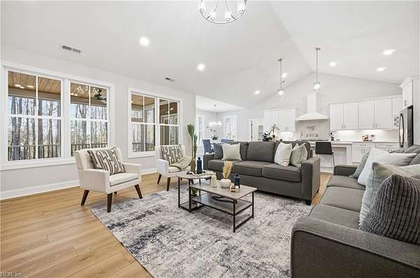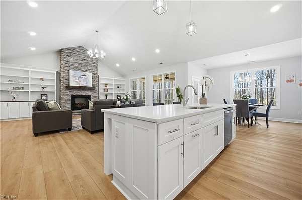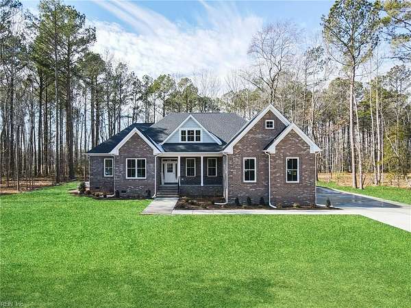New construction in Lawnes Point on the James, a scenic riverfront community in Smithfield perfect for those seeking a peaceful retreat surrounded by nature. This all-brick home features a thoughtfully designed layout with a luxurious first-floor primary suite, including a soaking tub, walk-in shower, double vanity, private water closet, and custom closet. Three additional bedrooms and two full baths are also on the main level, plus a fifth bedroom and full bath upstairs. The foyer opens to formal dining and a stunning family room with cathedral ceilings, a stone gas fireplace, and built-ins, flowing into a chef's dream kitchen with quartz countertops, a 36" range, double oven/microwave, wine cooler, large island, pot filler, and a huge walk-in pantry. Enjoy a screened porch overlooking a wooded homesite backing to Lawnes Creek, your private escape. 100% Complete!