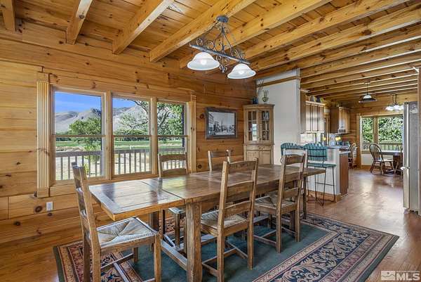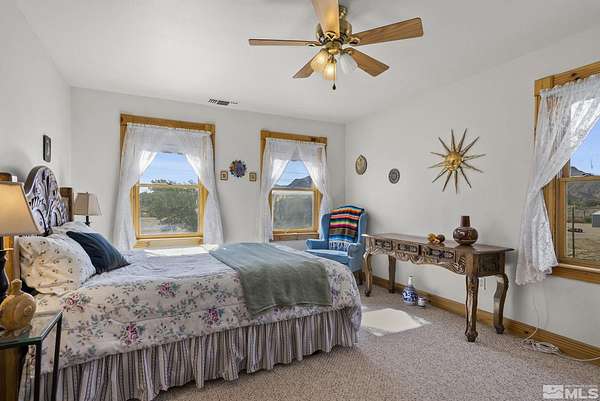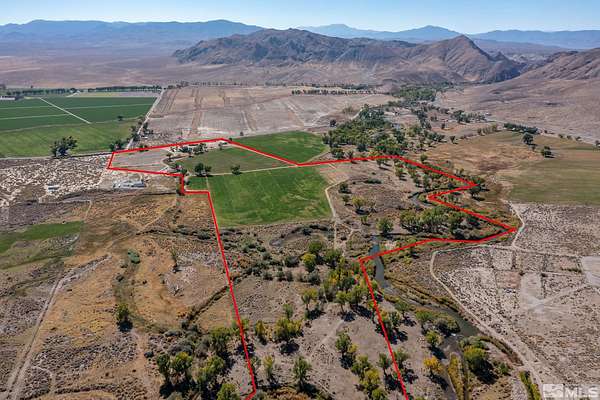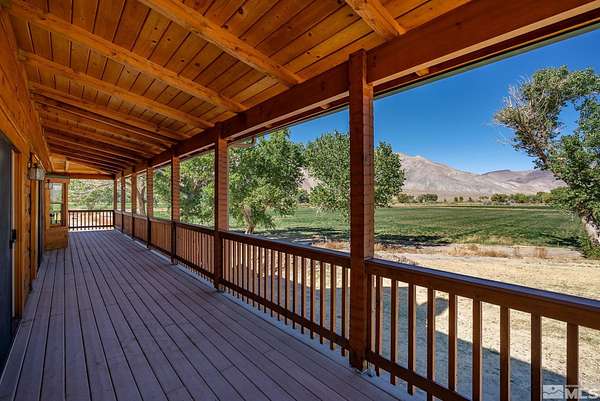 Welcome to Bent River Ranch - a rare and picturesque 88.49-acre gentleman's ranch set in the scenic beauty of Mason Valley, Nevada. The tranquil Walker River flows along the back of the property, creating a peaceful and private retreat with stunning 360 views of surrounding mountains and valleys. Includes 84.53 acres of 1861 senior water rights, 65.97 acre-feet of storage rights, a 40x60 ag/shop building, and 4-stall hay barn. The main home is a warm and inviting Appalachian-style Tennessee white pine log residence, offering 2,536 Sq. Ft of living space plus a 1,536 sq. ft. finished basement. With 5 bedrooms and 5.5 bathrooms, there's ample space for family and guests. A separate 3-bedroom, 2-bath converted mobile home (on a foundation) serves as ideal quarters or guests or caretaker. Produces organic alfalfa and grass. A large, laser-leveled field presents an excellent opportunity for horse facilities or other pursuits. The main floor of the home features a wraparound covered deck perfect for morning coffee or evening entertaining. Inside, enjoy a formal living room with a dramatic rock fireplace, spacious kitchen with Viking double oven gas range, breakfast nook, large butler's pantry, and a separate formal dinging room. The main-level primary suite offers private deck access, walk-in closet, soaking tub, dual vanities, and a separate shower. Upstairs you'll find two additional en-suite bedrooms, plus two more bedrooms and a full bathroom The finished basement is perfect for relaxation or recreation with a wet bar, large therapy pool, pellet store, full bath, laundry area, and gorgeous views. There's also a wine-making room, wine cellar, and ample storage throughout. Furnishings are negotiable-making this private, peaceful gentleman's ranch the perfect residence or multi-generational retreat.