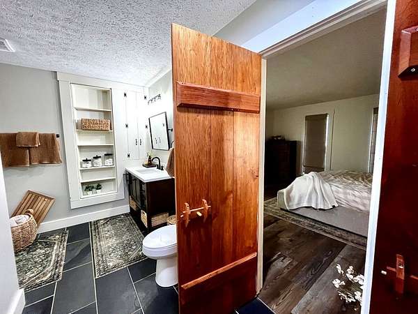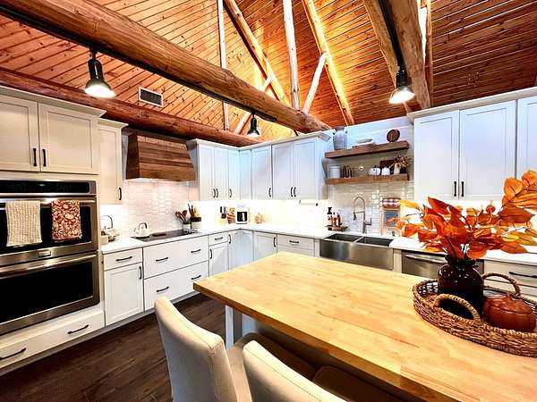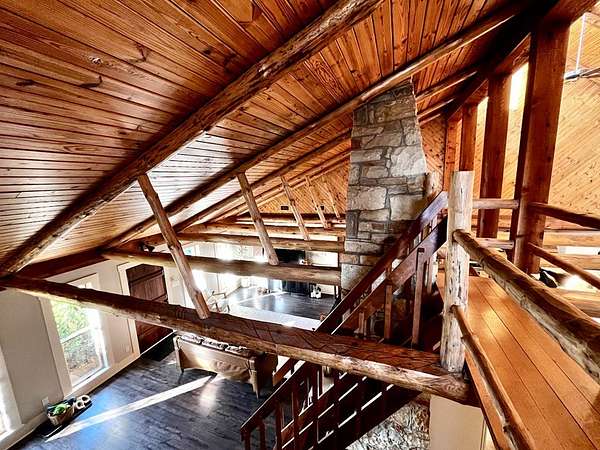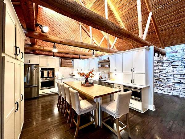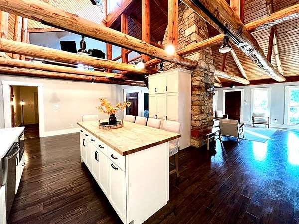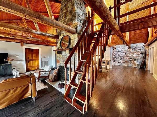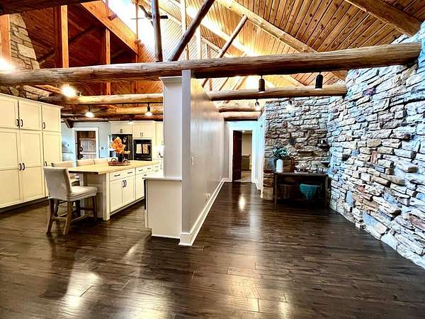 This striking subterranean stone ranch sits on 3.2 private acres just outside Bainbridge. A long, winding drive leads to this one-of-a-kind home lined with mature pine trees offering privacy and a peaceful setting. The exterior features a stone wall with waterfall, patio, detached pole barn, and an earthen berm used for recreational shooting. Inside, you'll find 3 bedrooms, 2 full baths, and over 2,500 sq ft of living space. The open-concept kitchen, dining, and family room feature vaulted wood ceilings, exposed beams, and skylight windows for natural light. The kitchen offers new countertops, cabinetry, and lighting. Enjoy the beautiful stone fireplace, an additional family room, and laundry area. The home also includes an underground dog fence and a 2018 metal roof. This unique property blends natural materials, modern updates, and serene surroundings--truly unlike anything else in the area.