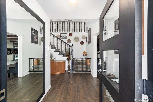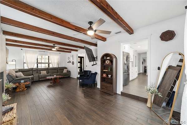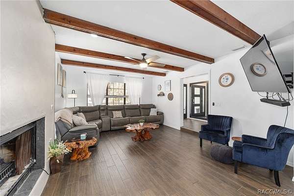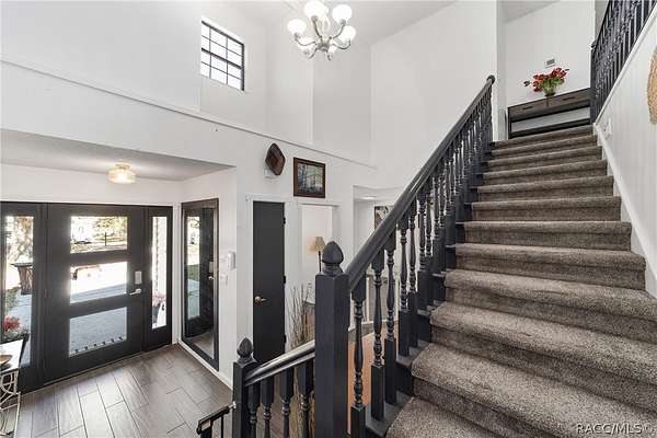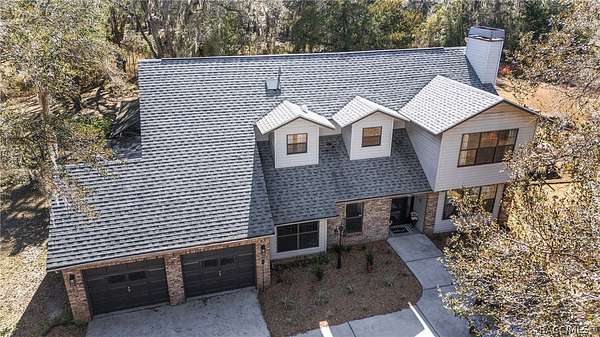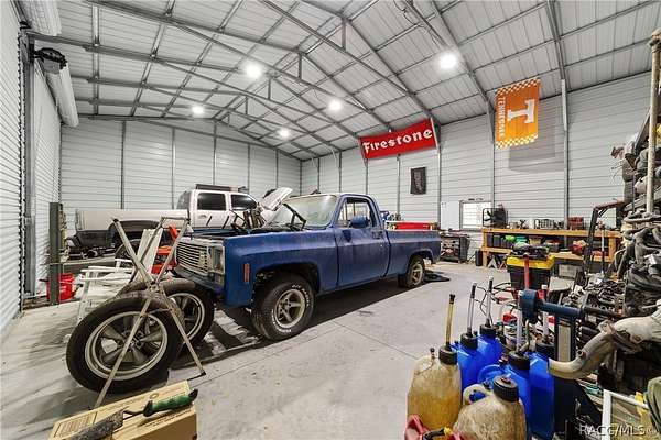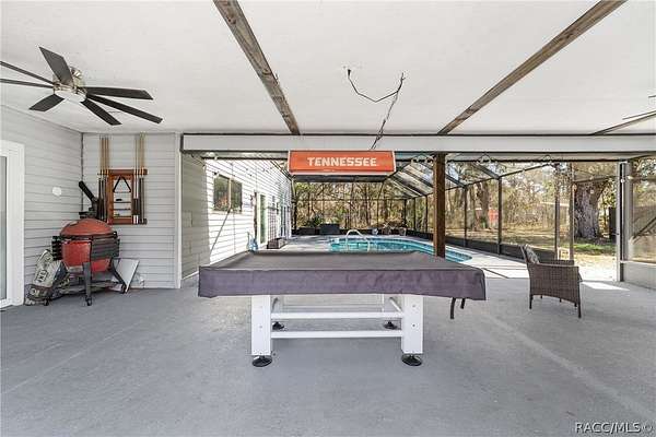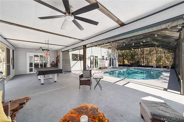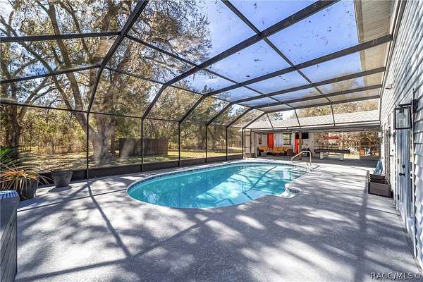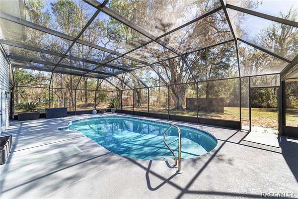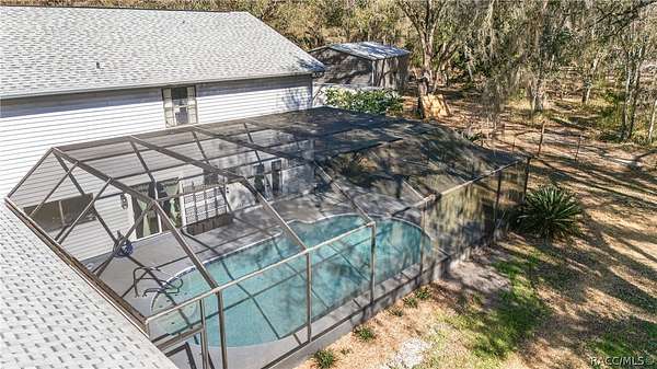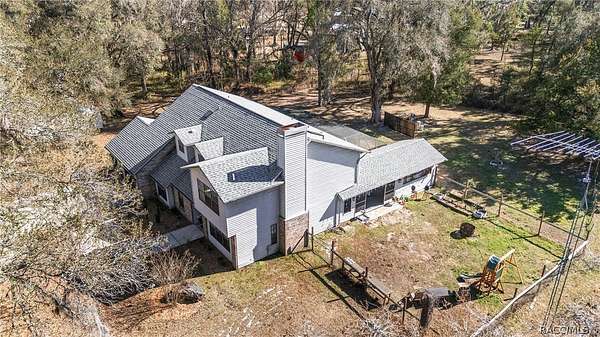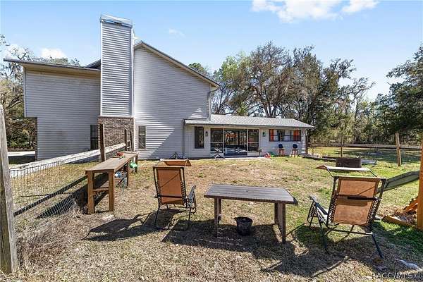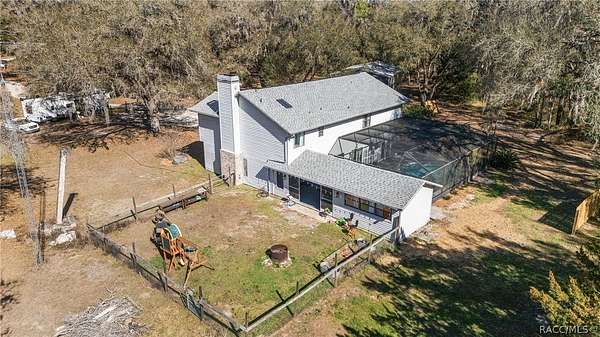 Experience unparalleled privacy with this stunning two-story pool estate, sprawling across nearly four acres on two separate parcels in the heart of Floral City's Floral Acres. This impressive residence offers over 3,200 square feet of living space, featuring three spacious bedrooms and three baths. The main level features a spacious layout designed for daily living and entertaining. The kitchen is well appointed with quartz countertops, a French door refrigerator with dual ice and craft ice, self-cleaning range with air fryer oven, large undermount sink and a large center island. Thoughtful storage solutions include a built-in spice rack, lazy Susan, large drawers for pots and pans, an appliance closet for small appliances and a pantry beneath the staircase. The kitchen has an eat-in kitchen and flows into the family room with a wood-burning fireplace. A dedicated office provides a private workspace, while a flex space off the pool area, currently utilized as a guest bedroom, includes an armoire that conveys with the property. A full bath with shower is also on the main level, offering convenient access for guests and pool use. A staircase leads to the upper level where all bedrooms are situated, each featuring large walk-in closets. The primary suite offers an open layout with three large windows that introduce natural light. The en-suite bath includes a freestanding tub, walk-in steam shower, double-sink vanity with quartz countertops and two linen closets. The second bedroom is generously sized and features an outer space mural accent wall and a large walk-in closet. The third bedroom also offers substantial space and a large walk-in closet. The upper-level bath serves these bedrooms and includes a double-sink vanity with quartz countertops and a newly remodeled shower. Outdoor living is centered around the private saltwater pool with screen enclosure and expansive covered lanai. Quadruple sliding screen doors open to a fully fenced area that includes a fire pit, garden space and swing set area, creating a functional setting for gatherings and year-round enjoyment. The property also includes a 30-by-40-foot detached metal building totaling approximately 1,200 square feet, suitable for storage, workshop space or recreational equipment, with a 20-by-30-foot concrete pad in front. Major system updates include a roof replacement completed in 2022 and two heating and air-conditioning systems, one serving the upper level and one the lower level, both replaced in 2022. Floral Acres is known for its larger homesites that provide space between residences and flexibility for outdoor use. The neighborhood is not governed by a mandatory homeowners association, offering added versatility for property owners. Floral City, in Citrus County, is recognized for its historic character and natural surroundings. Outdoor recreation is accessible nearby at the Withlacoochee State Trail, a 46-mile paved multiuse trail, and along the Withlacoochee River for boating, kayaking and freshwater fishing.