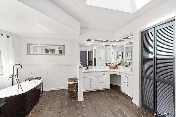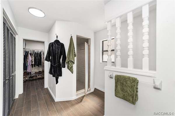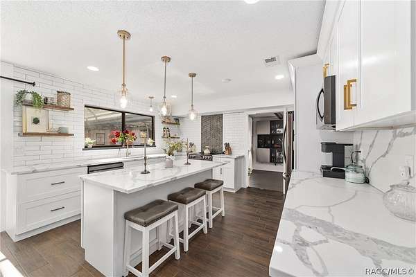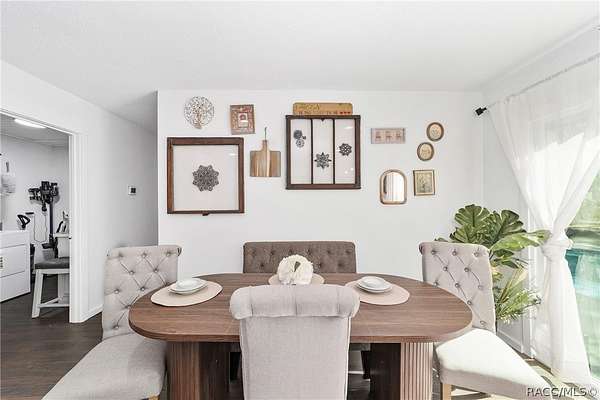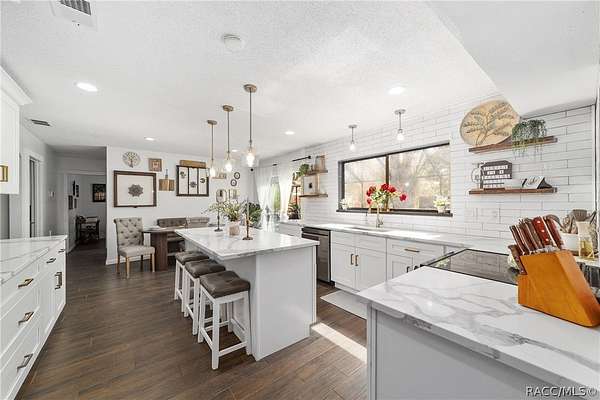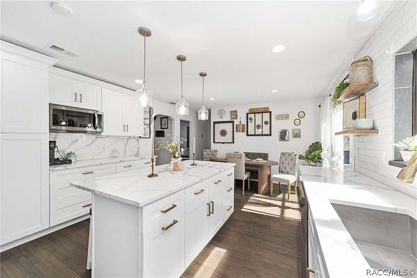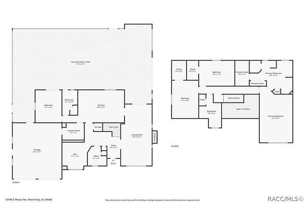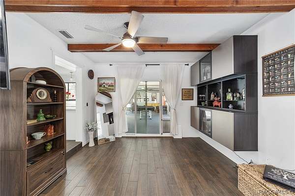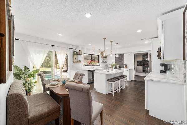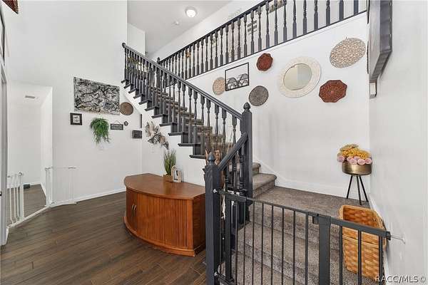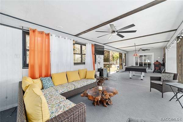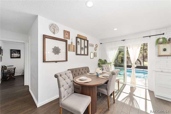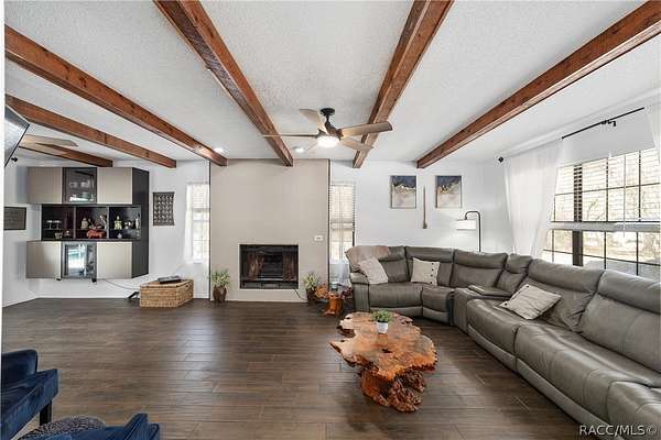 Experience unparalleled privacy with this stunning two-story pool estate, sprawling across nearly four acres on two separate parcels in the heart of Floral City's Floral Acres. This impressive residence offers over 3,200 square feet of living space, featuring three spacious bedrooms and three baths. The main level features a spacious layout designed for daily living and entertaining. The kitchen is well appointed with quartz countertops, a French door refrigerator with dual ice and craft ice, self-cleaning range with air fryer oven, large undermount sink and a large center island. Thoughtful storage solutions include a built-in spice rack, lazy Susan, large drawers for pots and pans, an appliance closet for small appliances and a pantry beneath the staircase. The kitchen has an eat-in kitchen and flows into the family room with a wood-burning fireplace. A dedicated office provides a private workspace, while a flex space off the pool area, currently utilized as a guest bedroom, includes an armoire that conveys with the property. A full bath with shower is also on the main level, offering convenient access for guests and pool use. A staircase leads to the upper level where all bedrooms are situated, each featuring large walk-in closets. The primary suite offers an open layout with three large windows that introduce natural light. The en-suite bath includes a freestanding tub, walk-in steam shower, double-sink vanity with quartz countertops and two linen closets. The second bedroom is generously sized and features an outer space mural accent wall and a large walk-in closet. The third bedroom also offers substantial space and a large walk-in closet. The upper-level bath serves these bedrooms and includes a double-sink vanity with quartz countertops and a newly remodeled shower. Outdoor living is centered around the private saltwater pool with screen enclosure and expansive covered lanai. Quadruple sliding screen doors open to a fully fenced area that includes a fire pit, garden space and swing set area, creating a functional setting for gatherings and year-round enjoyment. The property also includes a 30-by-40-foot detached metal building totaling approximately 1,200 square feet, suitable for storage, workshop space or recreational equipment, with a 20-by-30-foot concrete pad in front. Major system updates include a roof replacement completed in 2022 and two heating and air-conditioning systems, one serving the upper level and one the lower level, both replaced in 2022. Floral Acres is known for its larger homesites that provide space between residences and flexibility for outdoor use. The neighborhood is not governed by a mandatory homeowners association, offering added versatility for property owners. Floral City, in Citrus County, is recognized for its historic character and natural surroundings. Outdoor recreation is accessible nearby at the Withlacoochee State Trail, a 46-mile paved multiuse trail, and along the Withlacoochee River for boating, kayaking and freshwater fishing.
