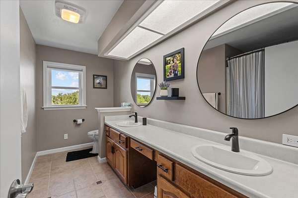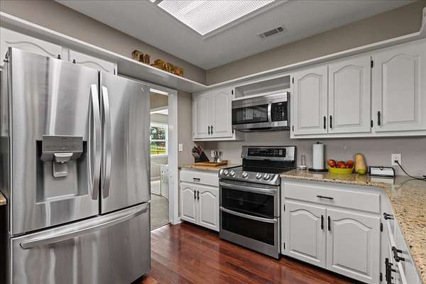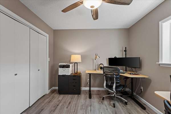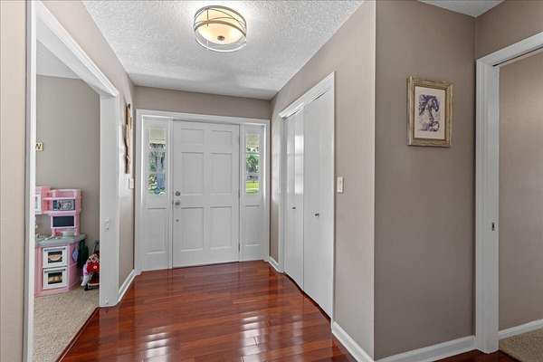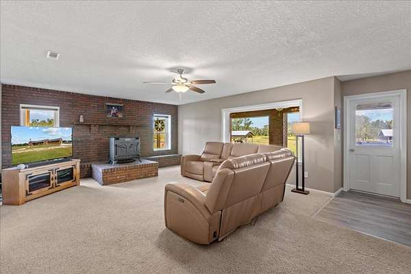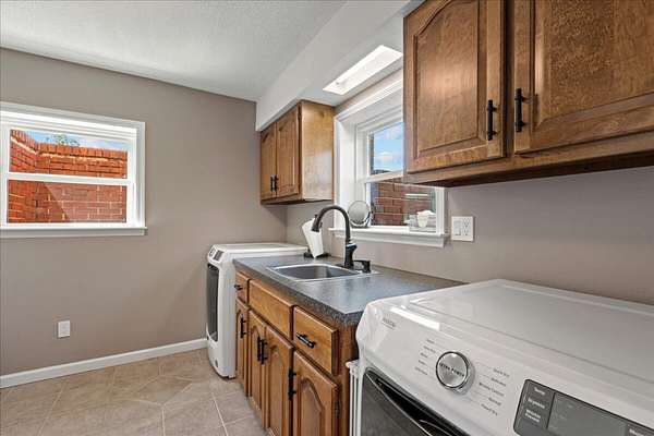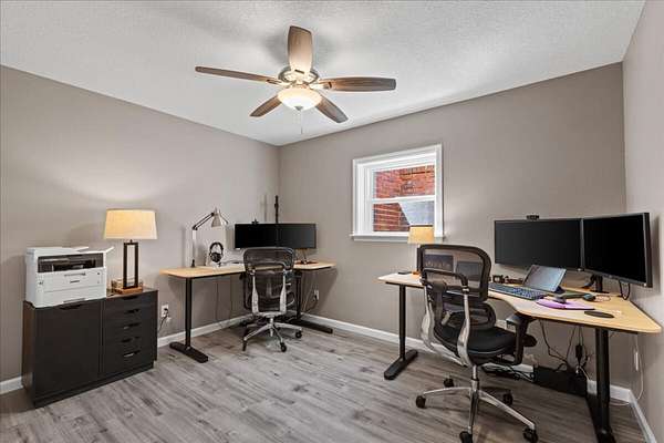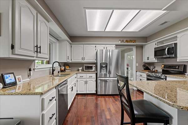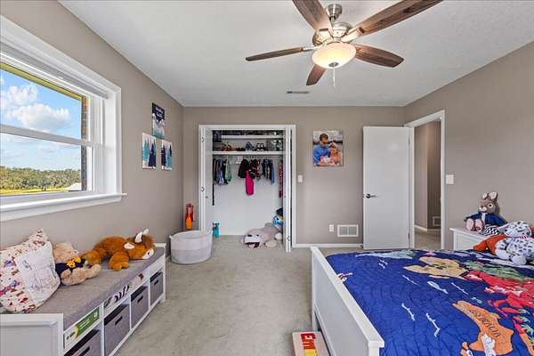 The 2,700+ sq. ft. brick home (with a new roof installed in 2023) offers 4 spacious bedrooms and 3 full bathrooms. Thoughtfully designed, the layout includes three bedrooms upstairs, along with a private downstairs suite that could serve as a fourth bedroom or a secluded office. Inside, every detail has been refreshed: the entire interior was freshly painted, new carpet was added to bedrooms (2023), and gleaming wood floors flow throughout the remaining spaces. Oversized picture windows installed in 2024 fill the home with natural light, while geothermal dual units and a new upstairs AC ensure comfort and efficiency. Additional highlights include 2x8 construction walls, lightning protection, generator hardwiring, abundant storage with custom built-ins, and new gutters. Outdoors, enjoy a covered patio and cook area, plus a shaded side yard with an installed awning.