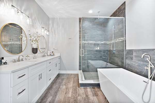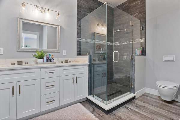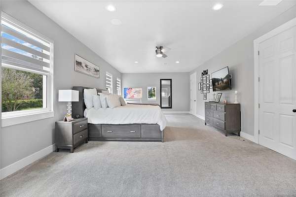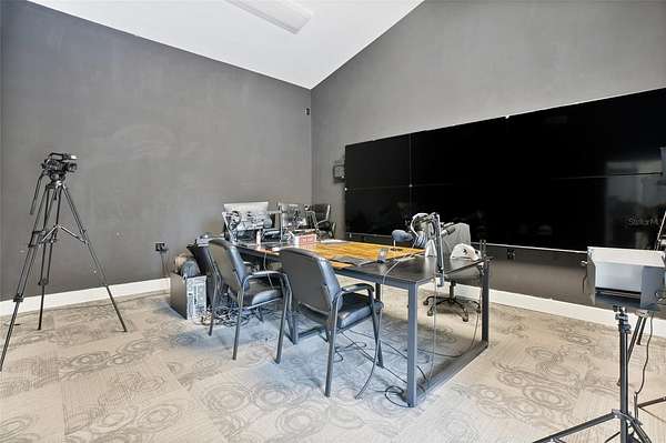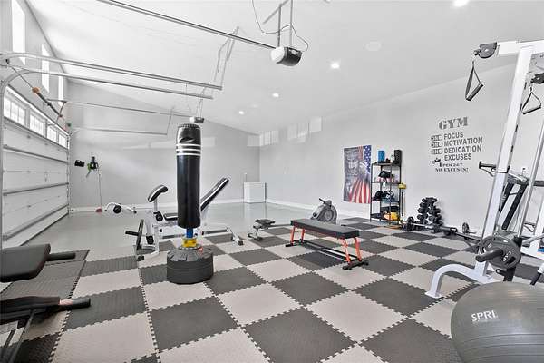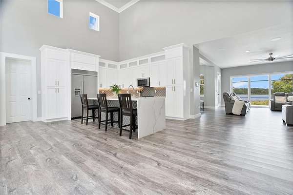This residence goes above and beyond by catering to various interests. Imagine having your very own podcast studio, a generously sized 3-car garage, energy-efficient solar panels, and a separate workshop building. The journey begins with an impressive entrance featuring soaring ceilings that set the tone for the meticulous craftsmanship found throughout. The heart of the home boasts an expansive open-concept chef's kitchen adorned with handcrafted cabinetry, quartz countertops, state-of-the-art appliances, and breathtaking views of the lake.