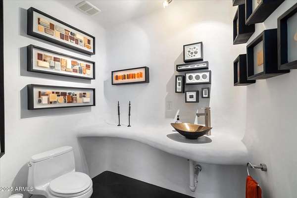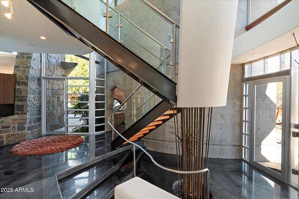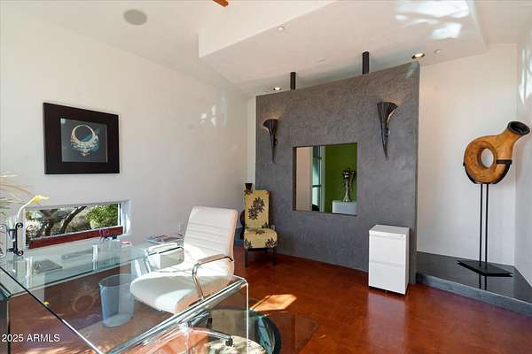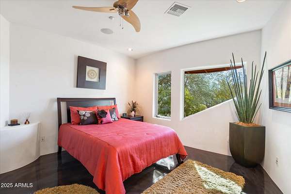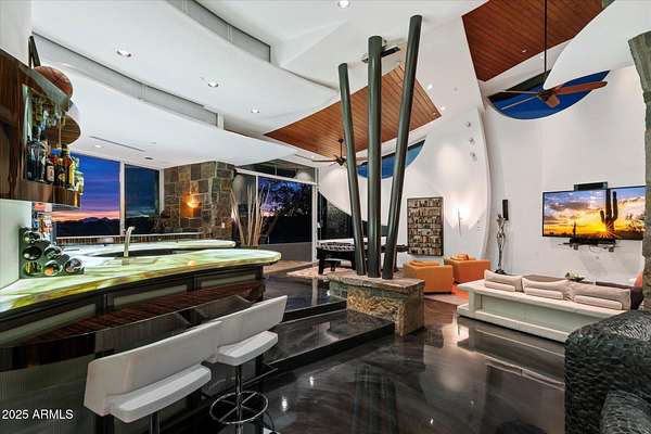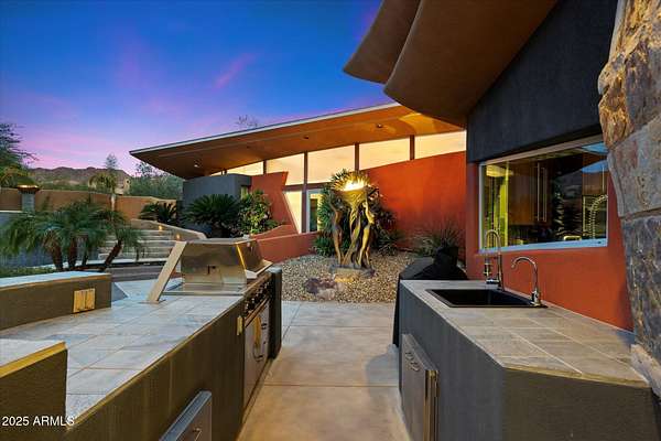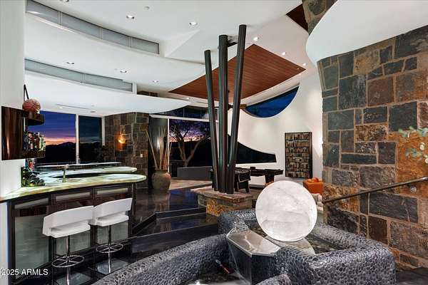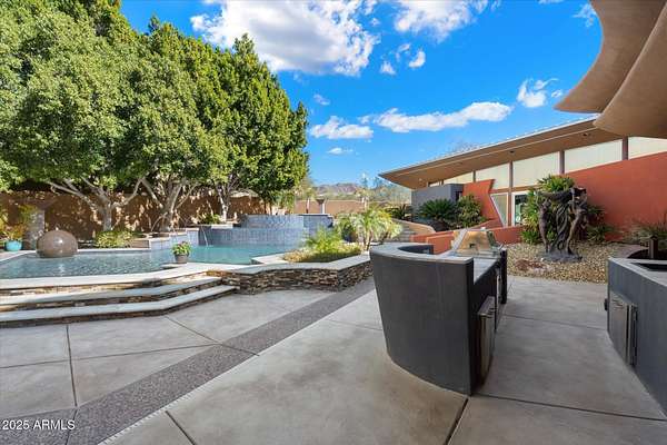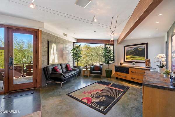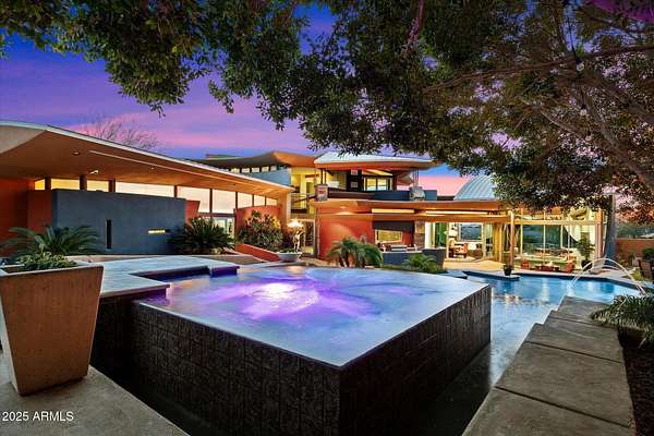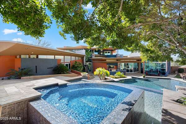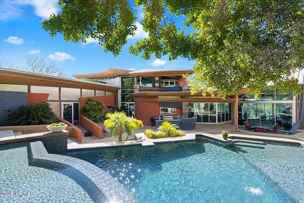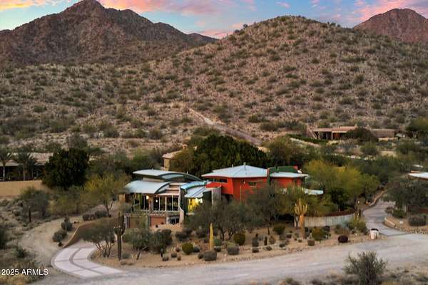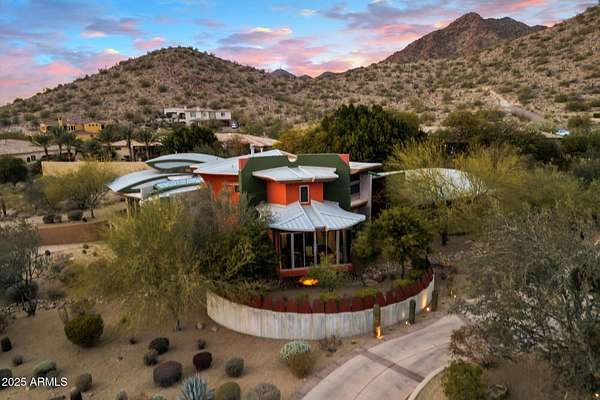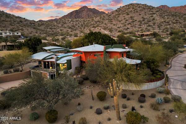 Experience unparalleled modern living in this 6,000-square-foot architectural masterpiece by renowned architect Jeffrey H. Page. Nestled at the base of Scottsdale Mountain, this home features a unique floor plan with a central core leading to a gourmet kitchen, spacious living areas, and three bedrooms, including an upstairs master suite. Energy-efficient design elements, such as super-insulated walls to ensure comfort year-round. Additional highlights include a secluded meditation room, a sculptural desert office, a 1,300-square-foot guest house, a naturally cooled six-car underground garage, and a backyard oasis with a swimming pool and party patio. Don't miss the opportunity to own this exceptional blend of innovative design and desert living.