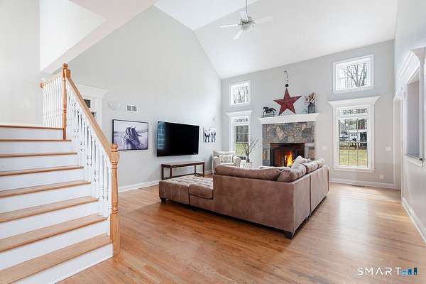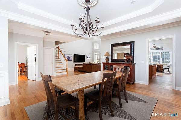 Custom-built Colonial privately set back from the road on nearly four acres of park-like grounds surrounded by mature trees and open green space. A charming covered front porch welcomes you into a thoughtfully designed interior filled with natural light and refined details. The main level features an open-concept layout with hardwood flooring throughout. The dining room showcases a tray ceiling, detailed picture molding, and an ideal flow for both everyday living and entertaining. A dedicated home office offers a quiet and functional workspace. The spacious living room impresses with a vaulted ceiling and fireplace, creating a warm and inviting gathering space. The kitchen blends style and function with granite countertops, stainless steel appliances, a center island, and a bright dining area with direct access to the patio, perfect for indoor-outdoor living. A main-level primary suite provides both convenience and privacy with a walk-in closet and well-appointed en-suite bath. A laundry room and powder room complete the first floor. Upstairs are three generously sized bedrooms, including one with an attached bonus room ideal for a playroom, study, or creative space. An additional flexible room offers the perfect setup for a second office, media room, or home gym. Additional features include a large unfinished basement with interior and garage access offering expansion potential, a three-car garage, expansive fenced yard, & a 10x20 barn.
