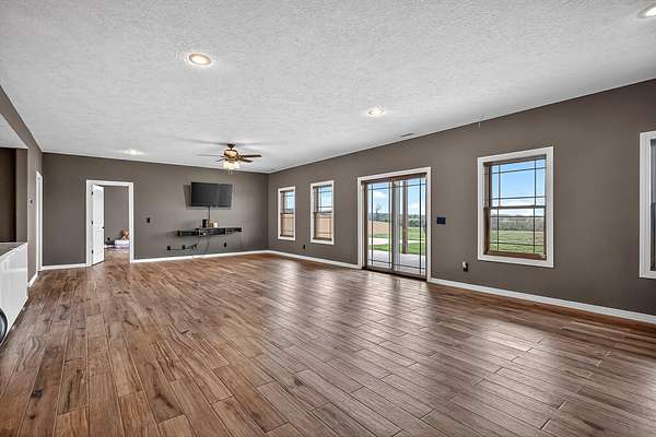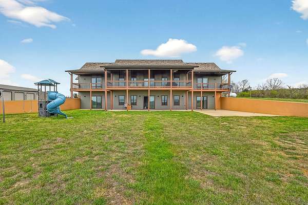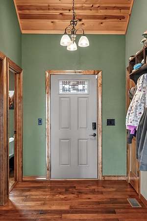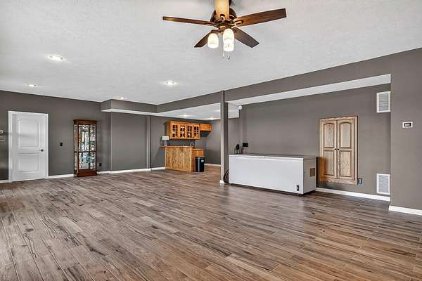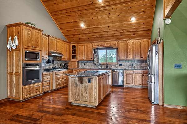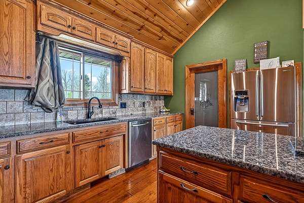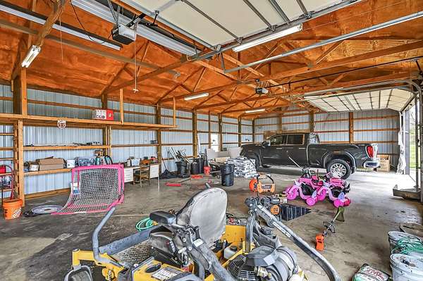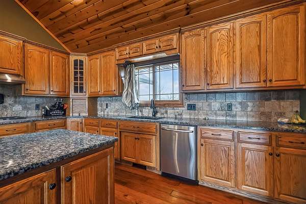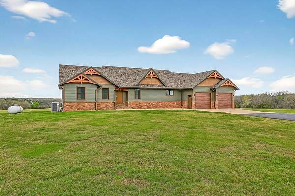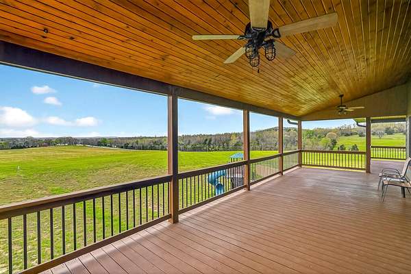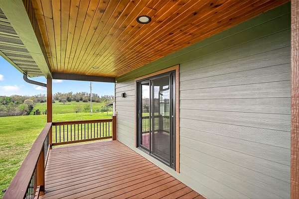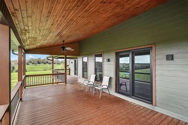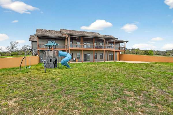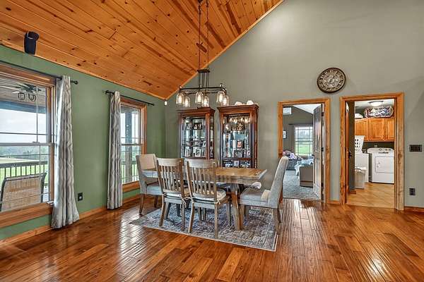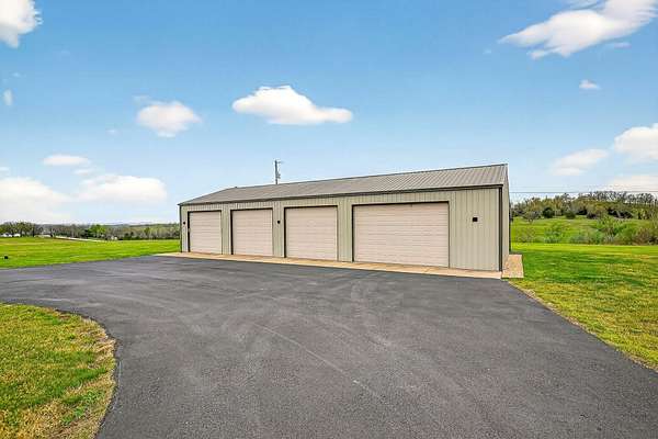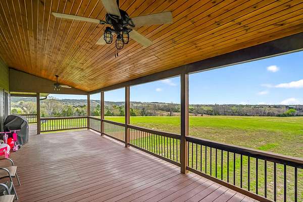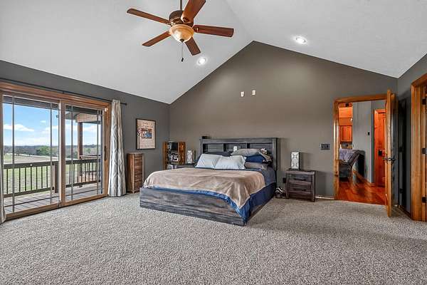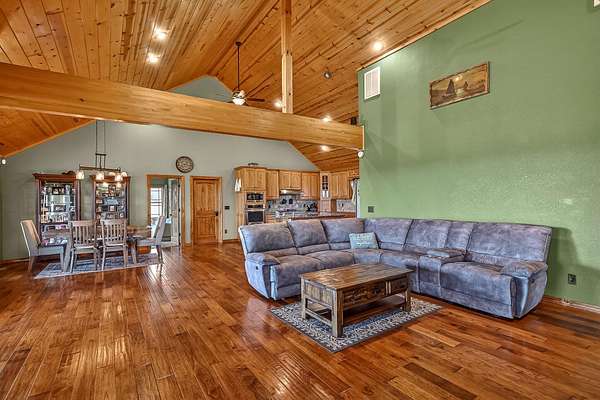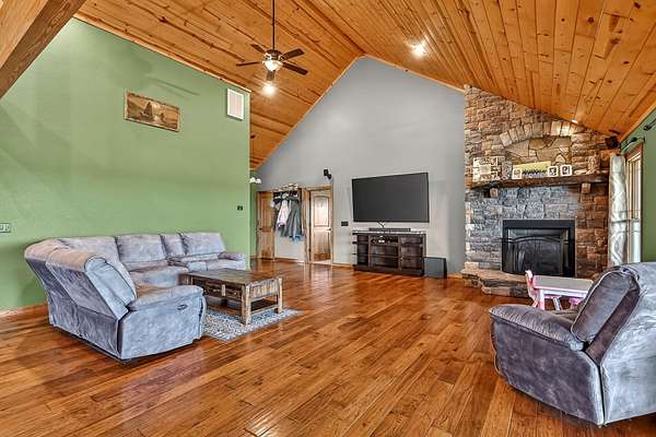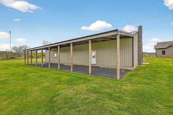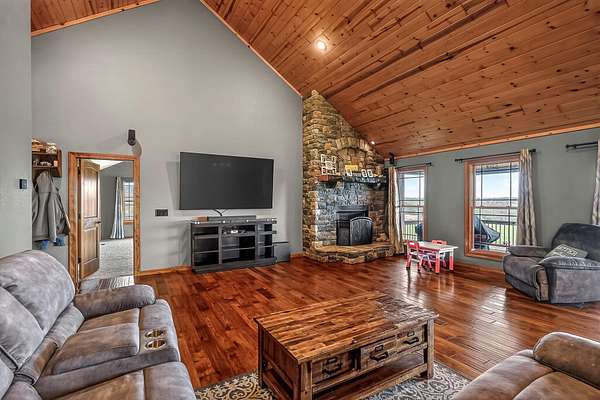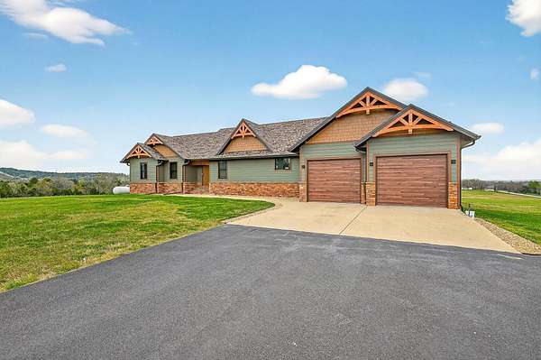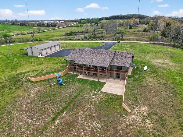 Welcome to this stunning property near the Arkansas line, just 5 minutes from Bull Shoals Lake, offering a perfect blend of privacy, acreage, and high-end finishes. Situated on 5 beautifully cleared panoramic acres, this walk-out basement home features 4 bedrooms, 3.5 bathrooms, a 2-car garage, and an impressive 70x29 detached shop. A paved circular drive leads you to the home, creating a private and inviting setting. Inside, you'll immediately notice the vaulted wood ceilings, rich wood flooring, and warm, welcoming feel. The open layout flows effortlessly from the living room--anchored by a stunning rock fireplace--into the kitchen and dining area.The kitchen is both functional and beautiful, featuring custom wood cabinetry, granite countertops, stainless steel appliances, a large center island, and a spacious walk-in pantry. The main living area opens to an expansive covered back deck, perfect for entertaining or taking in the peaceful views of your land. The primary suite is generously sized with vaulted ceilings, private access to the deck, and a well-appointed en-suite bath offering dual vanities, a walk-in shower, corner soaking tub, and a walk-in closet with built-in shelving. A second bedroom and full bathroom complete the main level, also with access to the deck. Downstairs, the walk-out basement provides incredible flexibility with a large second living area, wet bar, and space ideal for a game room, media room, or home gym. Two additional bedrooms open to the back patio and share a full bathroom. The detached shop is a standout feature with four garage bays and a large lean-to, giving you all the space you need for storage, hobbies, or equipment.Recent updates include new exterior siding and trim, asphalt driveway, gutters, soffit and fascia, trusses and gables, lighting, insulated garage doors, fresh paint, water filtration system, water softener, Delta fixtures, and new toilets.