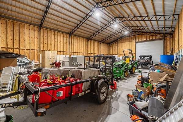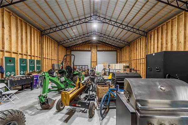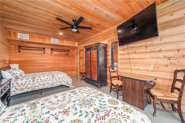 The improved homesite is designed in a camp-style layout and includes five separate structures centered around a common outdoor gathering area. Improvements include two private cabins with bathrooms, a central lodge with full kitchen and dining/gathering space, a bunk house with game room and garage, a standalone bath house, and an oversized 2,000+ square foot barn providing ample storage for boats, ATVs, tractors, and equipment.