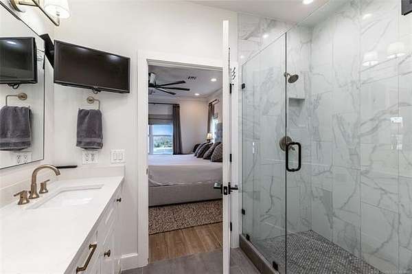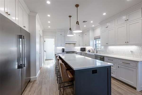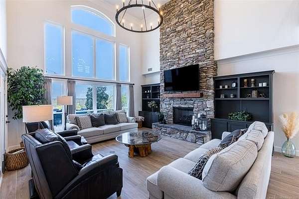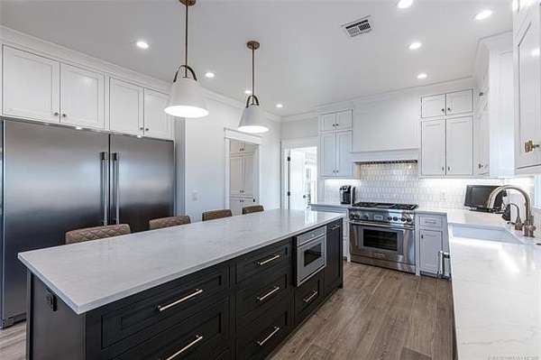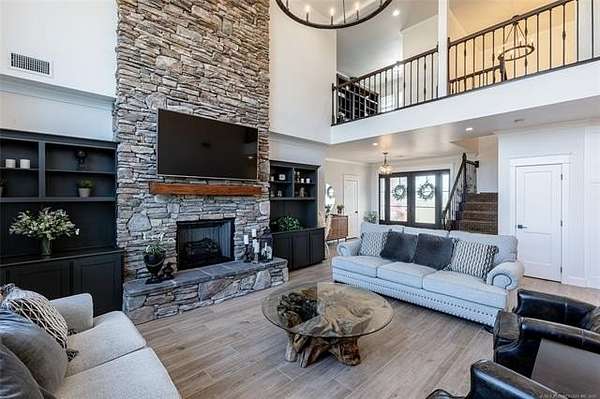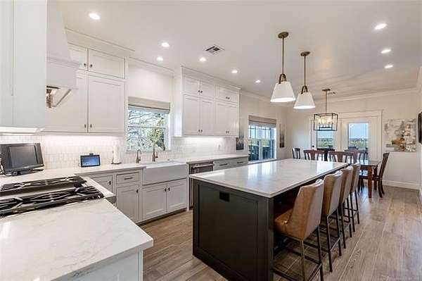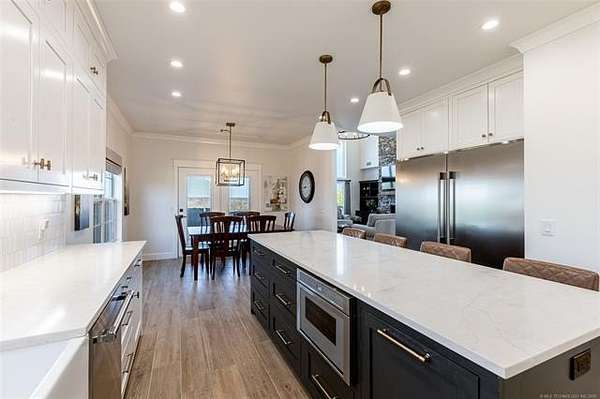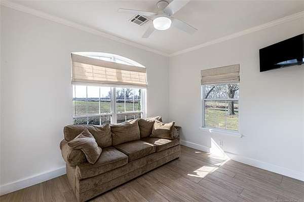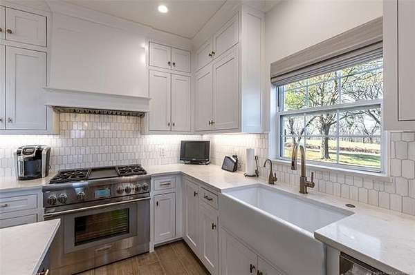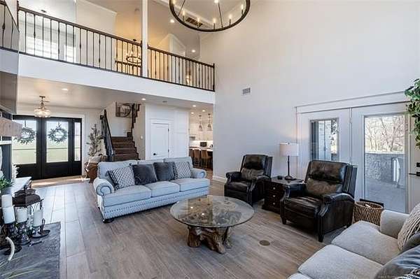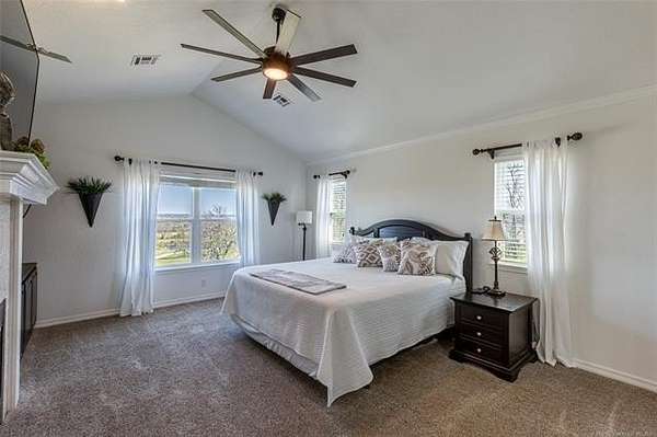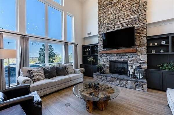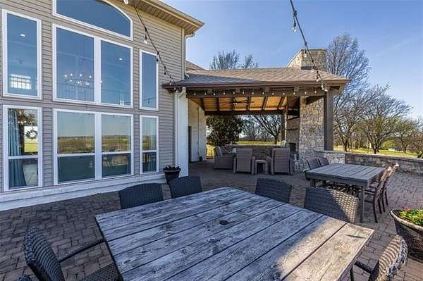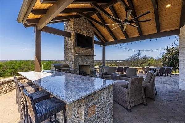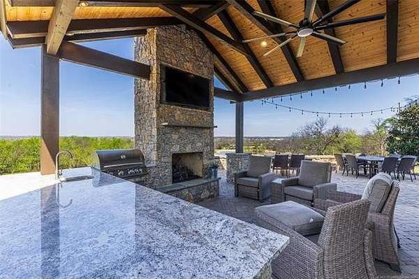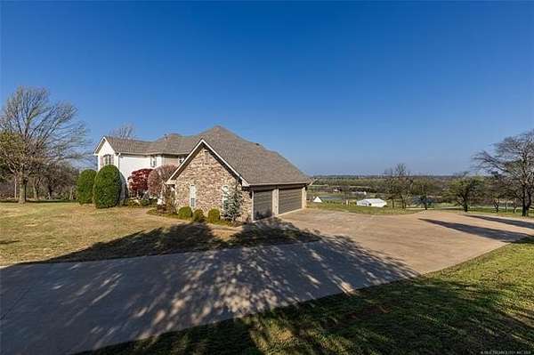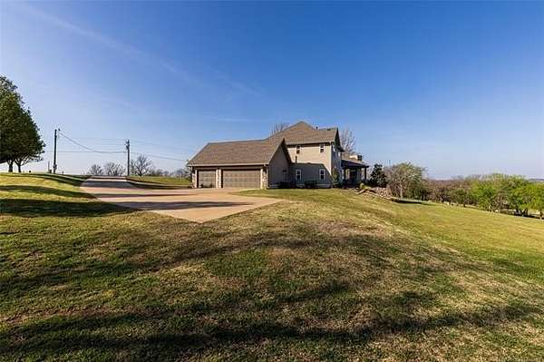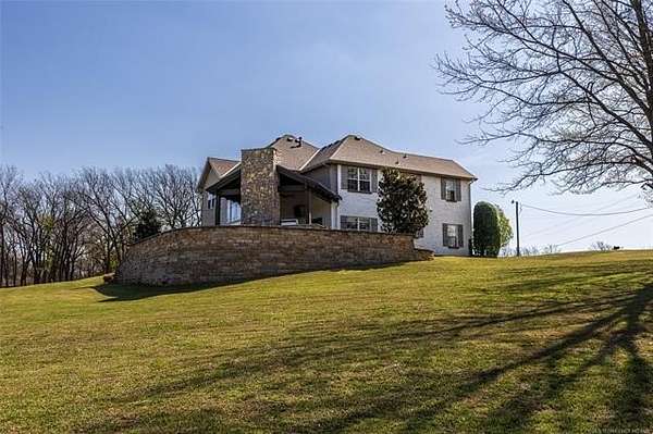 Some homes you simply have to experience in person... this is one of them. Perched atop 5+ scenic acres overlooking Claremore, this beautifully updated 3,230 sq ft (Courthouse) hilltop retreat captures sweeping year-round panoramic views that are nearly impossible to find. The great room is designed around the view with dramatic floor-to-ceiling windows and a striking lodge-style stone fireplace that anchors the space. Natural light pours in, creating a warm and inviting atmosphere throughout the home. The kitchen was completely remodeled down to the studs, featuring high-end appliances, custom cabinetry, and upscale finishes designed for both everyday living and entertaining. Extensive updates throughout the home include windows, flooring, lighting, plumbing fixtures, and doors. Outdoor living takes center stage with a covered patio, statement fireplace, outdoor kitchen, and breathtaking hilltop scenery-the kind of setting that makes every evening feel special. A second upstairs primary suite provides flexibility for guests or multi-generational living, while the built-in office landing offers a perfect workspace with character. Homes with this level of updates, acreage, and views rarely come available in this location. Schedule your showing and see why this property is truly one of Claremore's hidden gems.