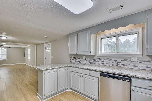 Tucked away off the main road, this beautifully renovated 2-bedroom, 2-bath modular home sits on 6 peaceful acres in Jefferson County (includes approx 1 acre pond). The open-concept layout connects the living, dining, and kitchen areas, featuring solid wood painted cabinets, granite countertops, glass tile backsplash, and stainless steel appliances. Updates include new exterior doors, entry steps, railings, roof, and gutters. Enjoy relaxing on the large 12' x 28' covered front porch overlooking a small pond. A 32' x 50' metal shop with poured concrete floor and roll-up doors on both sides provides excellent space for storage, hobbies, or a home business. This move-in ready property offers the perfect blend of modern comfort and rural charm.