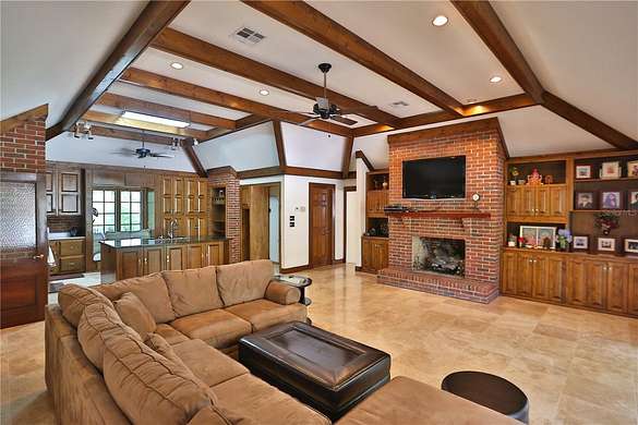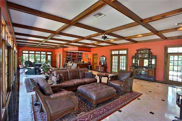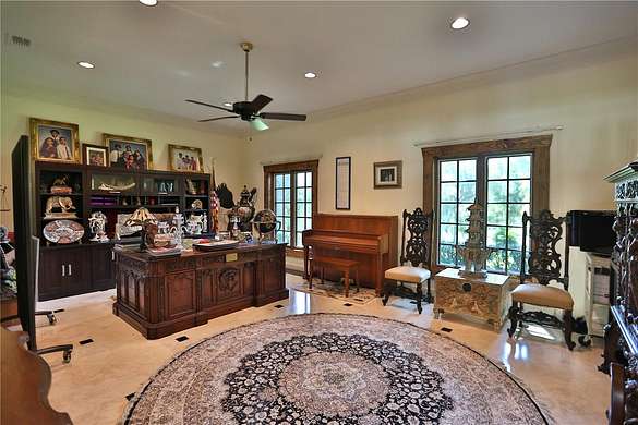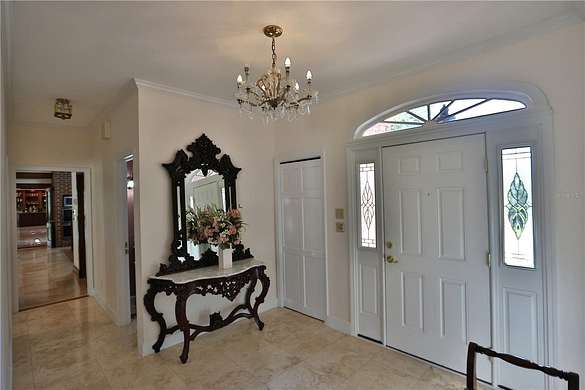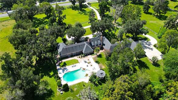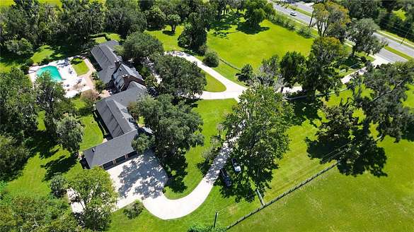 This 5. 60 +/- acres of beautifully landscaped land is gated and perimeter fenced for privacy. Magnificent home includes 5 bedrooms, 6 full and 1 half bath encompassing more than 7,000 SF of living area, a 4-car garage and pool. As you enter thru the gate the winding drive and Granddaddy Oaks will lead you to this estate. Custom designed estate with great architectural details everywhere you look. The home is designed for entertaining, open floor plan with billiards / game room, with full size wet bar tucked away. Some of the features include: built-in bookshelves, crown molding, gleaming travertine floors in the kitchen and in the common areas. Formal dining room overlooks the pool and lanai area. Beautiful outdoor area with pool, patio, cabana with plenty of seating areas to entertain your guests while enjoying the views of the property. Property is zoned A-1 so you can bring the horses!